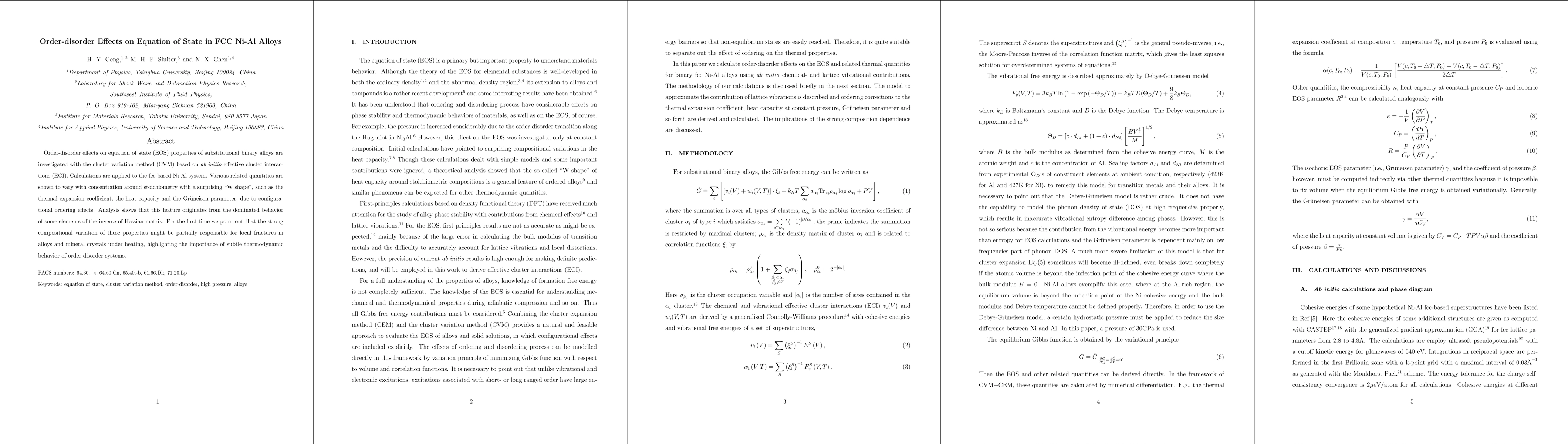 This study investigates how order-disorder phenomena in FCC Ni-Al alloys affect their equation of state using the cluster variation method, revealing a "W shape" variation in thermal expansion, heat capacity, and Gruneisen parameters due to configurational ordering effects, which may contribute to local fractures in alloys under heating.