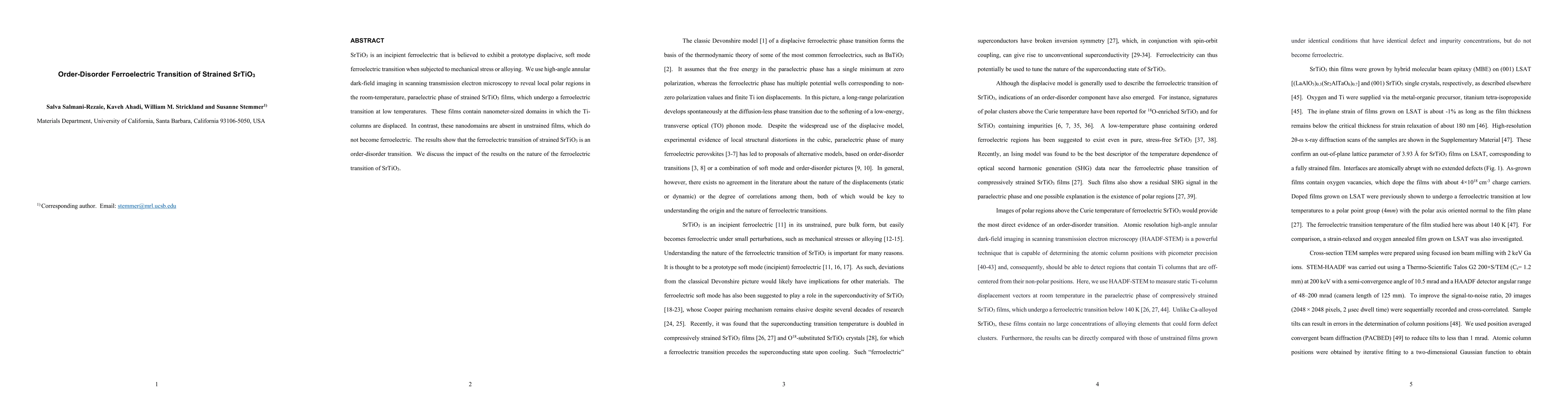 This study reveals that strained SrTiO3 undergoes a ferroelectric transition at low temperatures, characterized by the formation of nanometer-sized polar domains with displaced Ti columns, indicating an order-disorder transition, unlike unstrained films which remain paraelectric. The findings highlight the role of mechanical stress in inducing ferroelectricity in SrTiO3.