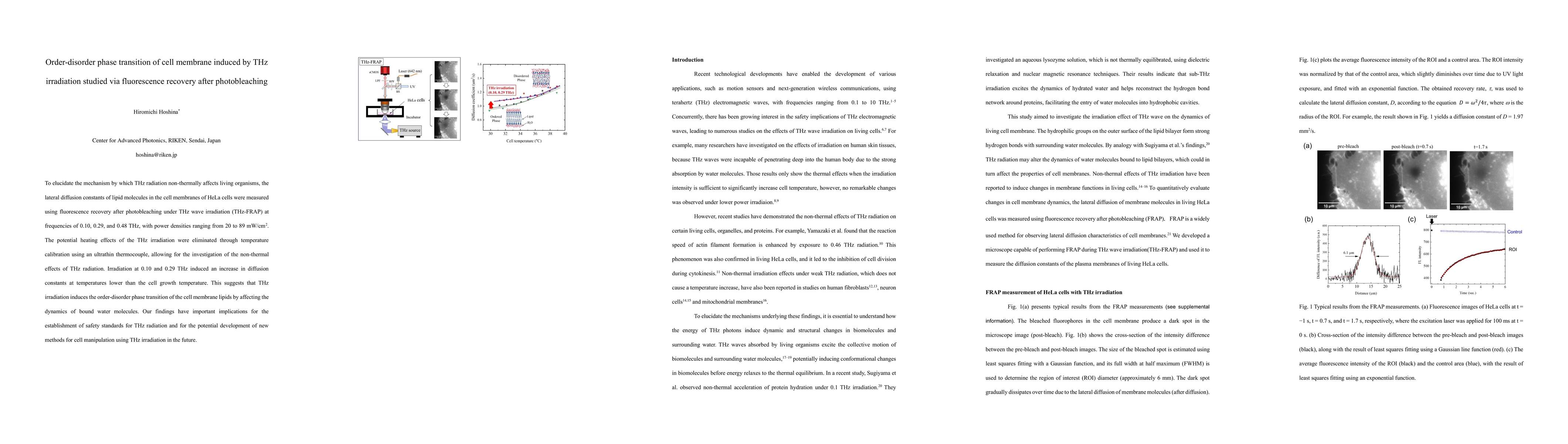 This study examines the non-thermal effects of THz radiation on the order-disorder phase transition of HeLa cell membranes using THz-FRAP, finding increased lipid diffusion at specific frequencies. The research suggests THz irradiation affects bound water molecules, leading to membrane lipid transitions, with implications for THz safety and potential cell manipulation techniques.