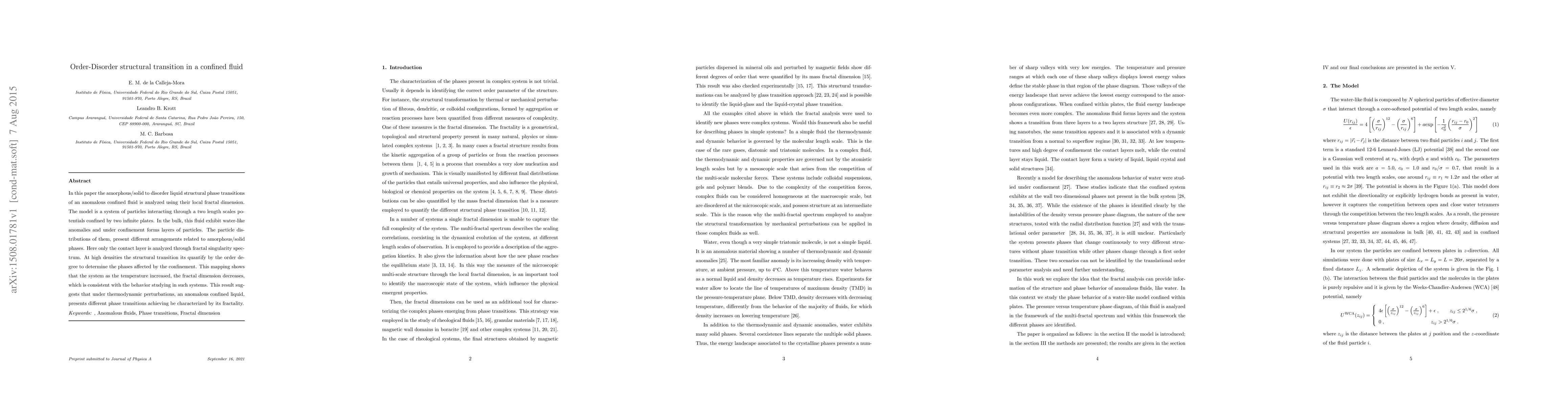 In this paper the amorphous/solid to disorder liquid structural phase transitions of an anomalous confined fluid is analyzed using their local fractal dimension. The model is a system of particles interacting through a two length scales potentials confined by two infinite plates. In the bulk, this fluid exhibit water-like anomalies and under confinement forms layers of particles. The particle distributions of them, present different arrangements related to amorphous/solid phases. Here only the contact layer is analyzed through fractal singularity spectrum. At high densities the structural transition its quantify by the order degree to determine the phases affected by the confinement. This mapping shows that the system as the temperature increased, the fractal dimension decreases, which is consistent with the behavior studying in such systems. This result suggests that under thermodynamic perturbations, an anomalous confined liquid, presents different phase transitions achieving be characterized by its fractality.