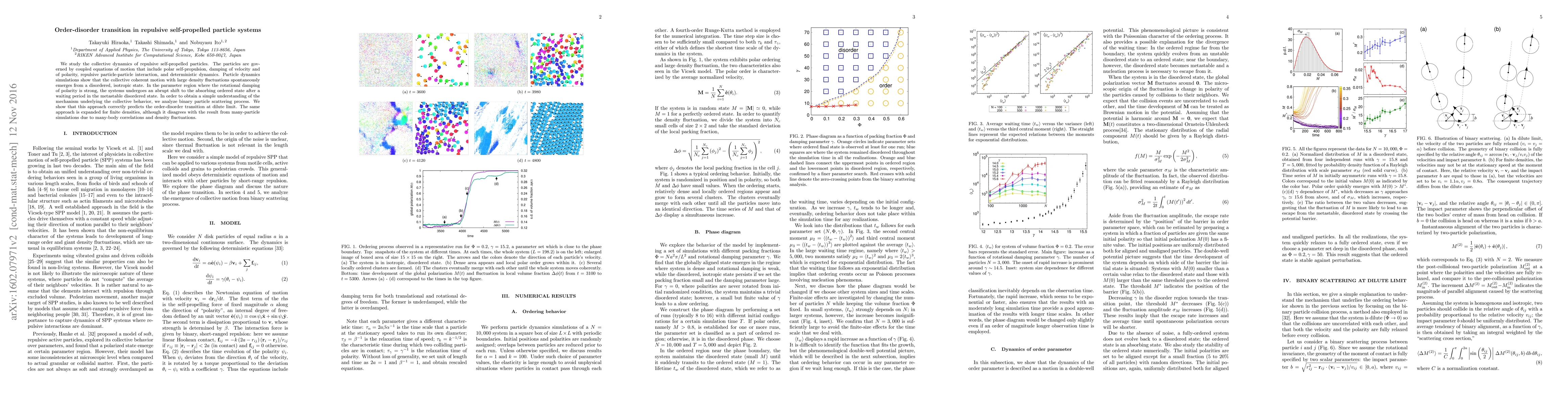 We study the collective dynamics of repulsive self-propelled particles. The particles are governed by coupled equations of motion that include polar self-propulsion, damping of velocity and of polarity, repulsive particle-particle interaction, and deterministic dynamics. Particle dynamics simulations show that the collective coherent motion with large density fluctuations spontaneously emerges from a disordered, isotropic state. In the parameter region where the rotational damping of polarity is strong, the systems undergoes an abrupt shift to the absorbing ordered state after a waiting period in the metastable disordered state. In order to obtain a simple understanding of the mechanism underlying the collective behavior, we analyze binary particle scattering process. We show that this approach correctly predicts the order-disorder transition at dilute limit. The same approach is expanded for finite densities, although it disagrees with the result from many-particle simulations due to many-body correlations and density fluctuations.