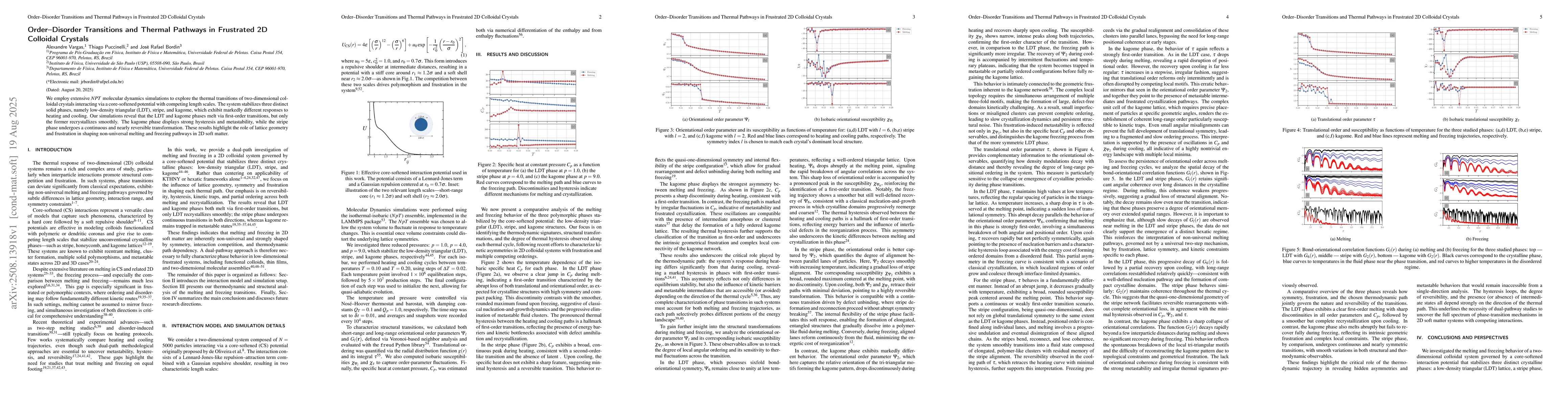 The paper presents a detailed analysis of thermal transitions in 2D colloidal crystals using molecular dynamics simulations, revealing distinct melting and freezing behaviors for LDT, stripe, and kagome phases.
