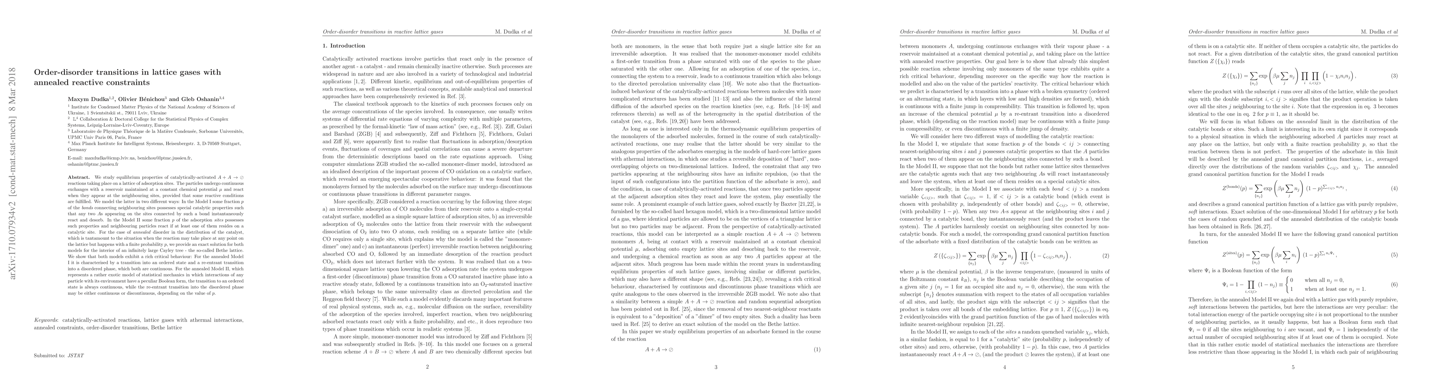 We study equilibrium properties of catalytically-activated $A + A \to \oslash$ reactions taking place on a lattice of adsorption sites. The particles undergo continuous exchanges with a reservoir maintained at a constant chemical potential $\mu$ and react when they appear at the neighbouring sites, provided that some reactive conditions are fulfilled. We model the latter in two different ways: In the Model I some fraction $p$ of the {\em bonds} connecting neighbouring sites possesses special catalytic properties such that any two $A$s appearing on the sites connected by such a bond instantaneously react and desorb. In the Model II some fraction $p$ of the adsorption {\em sites} possesses such properties and neighbouring particles react if at least one of them resides on a catalytic site. For the case of \textit{annealed} disorder in the distribution of the catalyst, which is tantamount to the situation when the reaction may take place at any point on the lattice but happens with a finite probability $p$, we provide an exact solution for both models for the interior of an infinitely large Cayley tree - the so-called Bethe lattice. We show that both models exhibit a rich critical behaviour: For the annealed Model I it is characterised by a transition into an ordered state and a re-entrant transition into a disordered phase, which both are continuous. For the annealed Model II, which represents a rather exotic model of statistical mechanics in which interactions of any particle with its environment have a peculiar Boolean form, the transition to an ordered state is always continuous, while the re-entrant transition into the disordered phase may be either continuous or discontinuous, depending on the value of $p$.