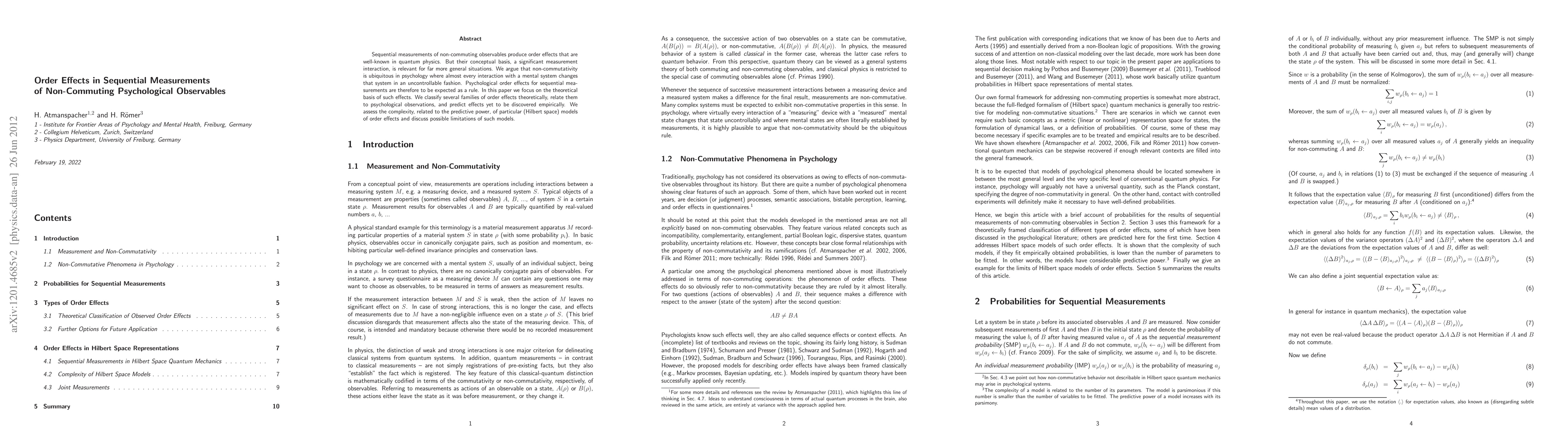 This paper explores the theoretical basis of order effects in sequential measurements of non-commuting psychological observables, drawing parallels to quantum physics. It classifies various types of order effects, relates them to psychological phenomena, and discusses the complexity and limitations of using Hilbert space models to predict these effects.