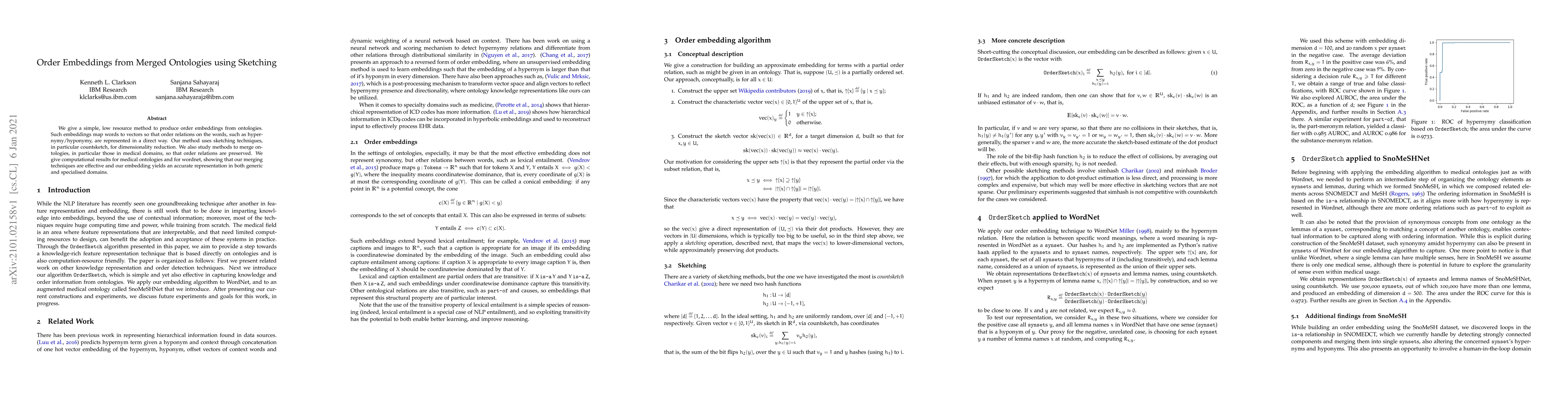We give a simple, low resource method to produce order embeddings from ontologies. Such embeddings map words to vectors so that order relations on the words, such as hypernymy/hyponymy, are represented in a direct way. Our method uses sketching techniques, in particular countsketch, for dimensionality reduction. We also study methods to merge ontologies, in particular those in medical domains, so that order relations are preserved. We give computational results for medical ontologies and for wordnet, showing that our merging techniques are effective and our embedding yields an accurate representation in both generic and specialised domains.