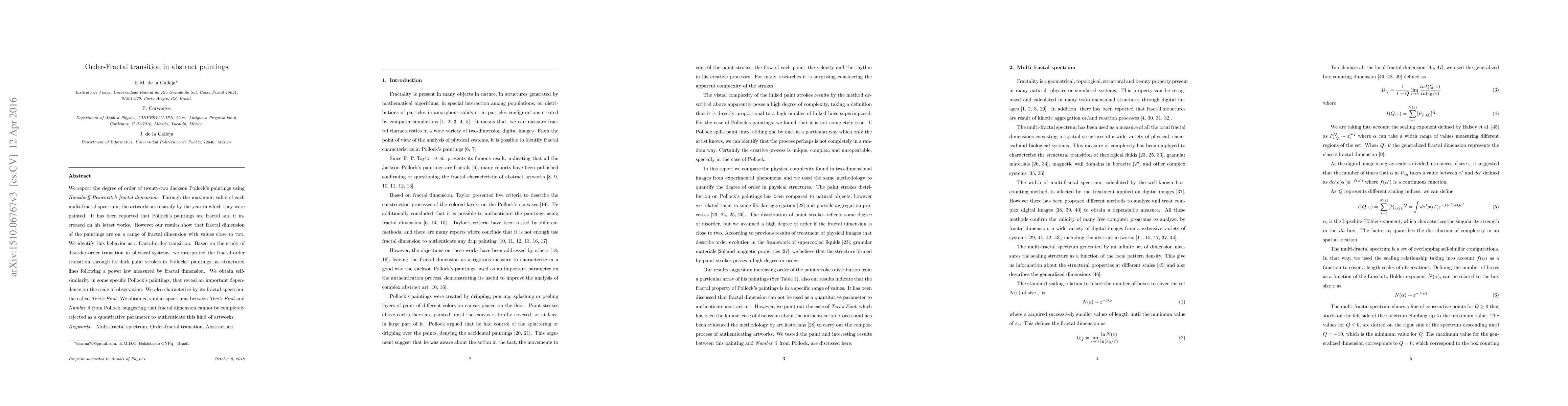 This study analyzes the fractal dimension of Jackson Pollock's paintings to identify an order-fractal transition, revealing that while Pollock's works exhibit fractal characteristics, their fractal dimensions cluster around two, indicating a fractal-order transition rather than a purely fractal nature. The findings suggest that fractal dimension could be a useful parameter for authenticating certain artworks.