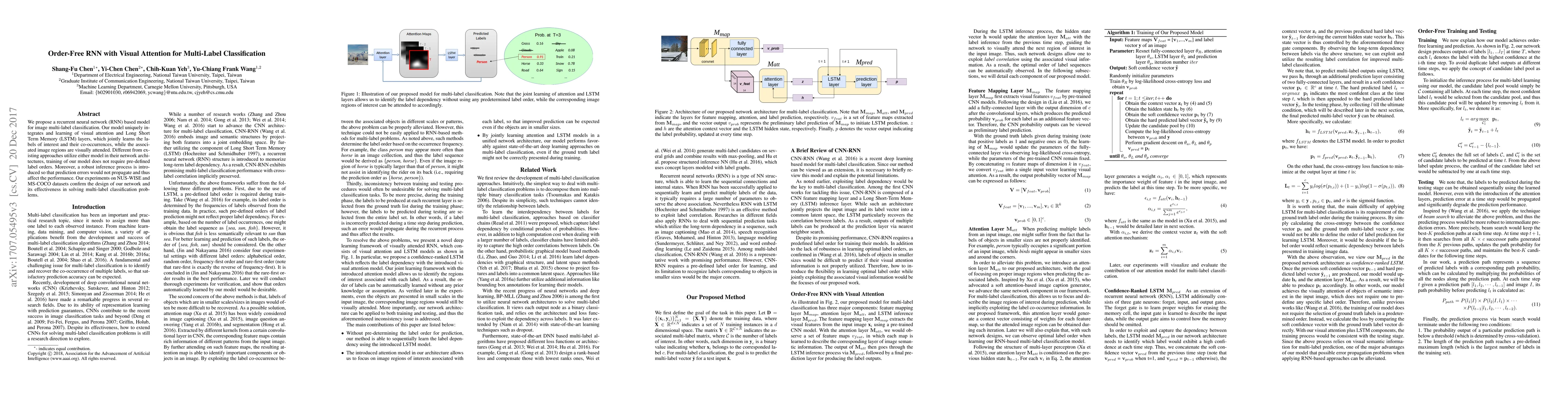 This paper introduces an innovative order-free RNN with visual attention for multi-label classification, combining attention and LSTM models to efficiently predict multiple labels without requiring predefined label sequences, thus avoiding error propagation and leveraging label co-occurrence information.
