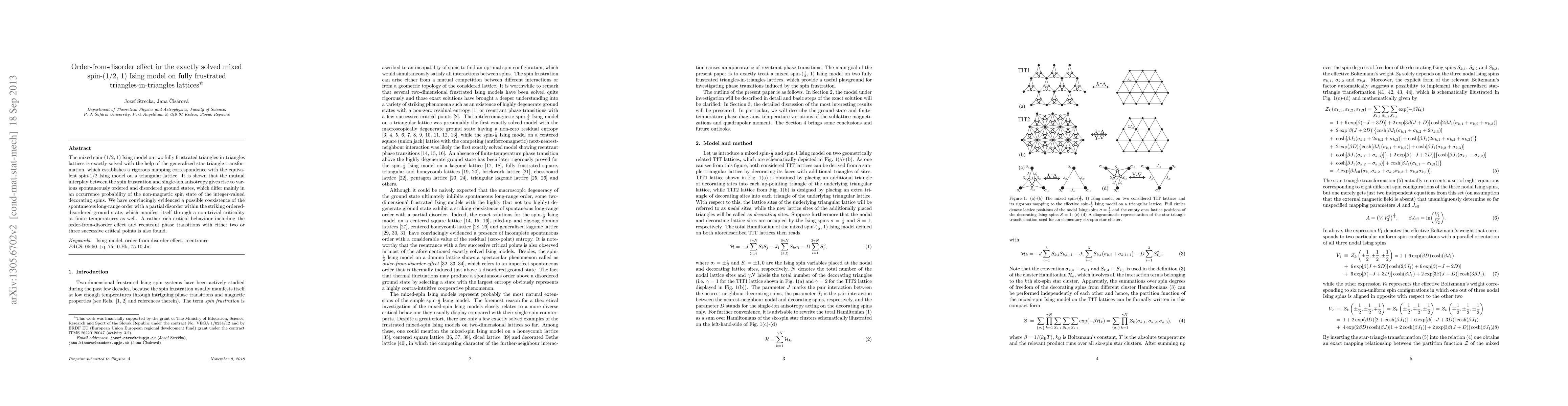 The mixed spin-(1/2, 1) Ising model on frustrated triangles-in-triangles lattices is exactly solved, revealing a complex interplay between spin frustration and anisotropy leading to diverse ground states, including an ordered-disordered phase with critical behavior and reentrant transitions. The study highlights the order-from-disorder effect and the coexistence of long-range order with partial disorder.