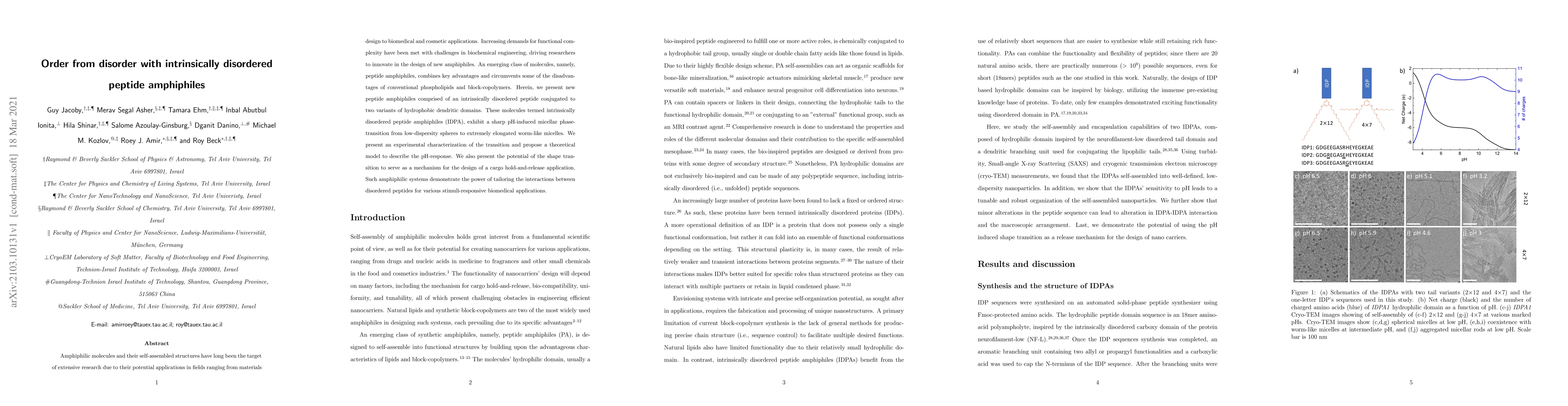 This paper introduces intrinsically disordered peptide amphiphiles (IDPA) that undergo a sharp pH-induced phase-transition from spherical to elongated worm-like micelles, showcasing potential for cargo hold-and-release applications. The study combines experimental characterization and theoretical modeling to elucidate the mechanism behind this shape transition.