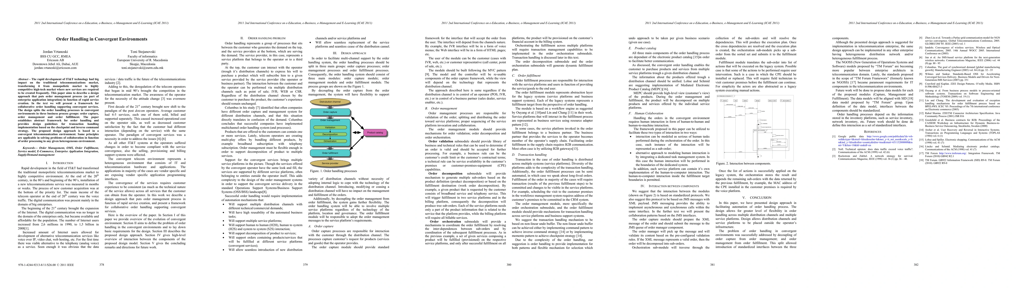The rapid development of IT&T technology had big impact on the traditional telecommunications market, transforming it from monopolistic market to highly competitive high-tech market where new services are required to be created frequently. This paper aims to describe a design approach that puts order management process (as part of enterprise application integration) in function of rapid service creation. In the text we will present a framework for collaborative order handling supporting convergent services. The design splits the order handling processes in convergent environments in three business process groups: order capture, order management and order fulfillment. The paper establishes abstract framework for order handling and provides design guidelines for transaction handling implementation based on the checkpoint and inverse command strategy. The proposed design approach is based in a convergent telecommunication environment. Same principles are applicable in solving problems of collaboration in function of order processing in any given heterogeneous environment.