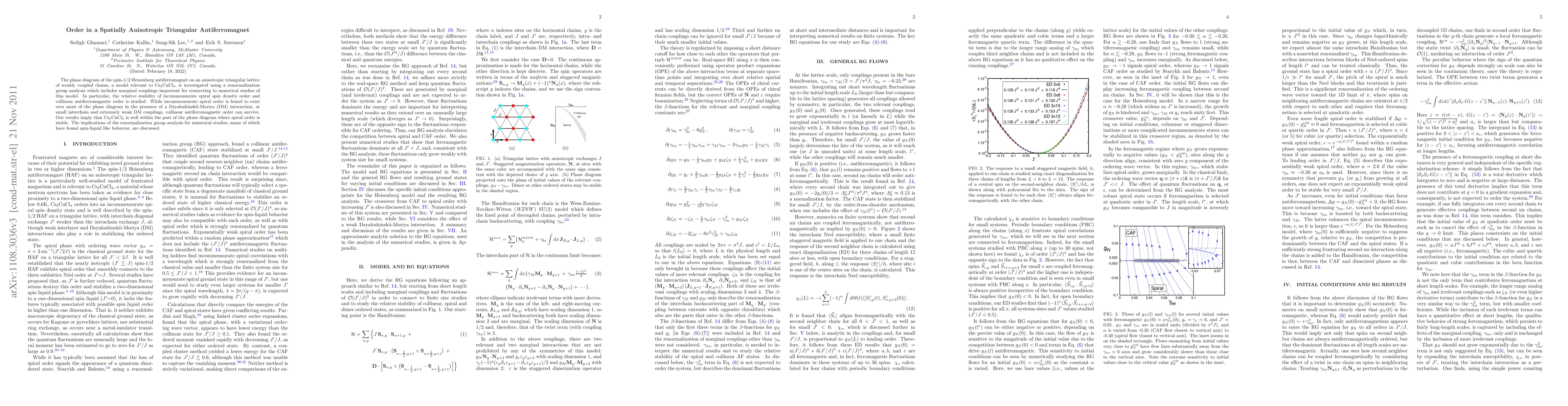 The phase diagram of the spin-1/2 Heisenberg antiferromagnet on an anisotropic triangular lattice of weakly coupled chains, a model relevant to Cs2CuCl4, is investigated using a renormalization group analysis, which includes marginal couplings important for connecting to numerical studies of this model. In particular, the relative stability of incommensurate spiral spin-density order and collinear antiferromagnetic order is studied. While incommensurate spiral order is found to exist over most of the phase diagram in the presence of a Dzyaloshinskii-Moriya (DM) interaction, at small interchain and extremely weak DM couplings, collinear antiferromagnetic order can survive. Our results imply that Cs2CuCl4 is well within the part of the phase diagram where spiral order is stable. The implications of the renormalization group analysis for numerical studies, many of which have found spin-liquidlike behavior, are discussed.