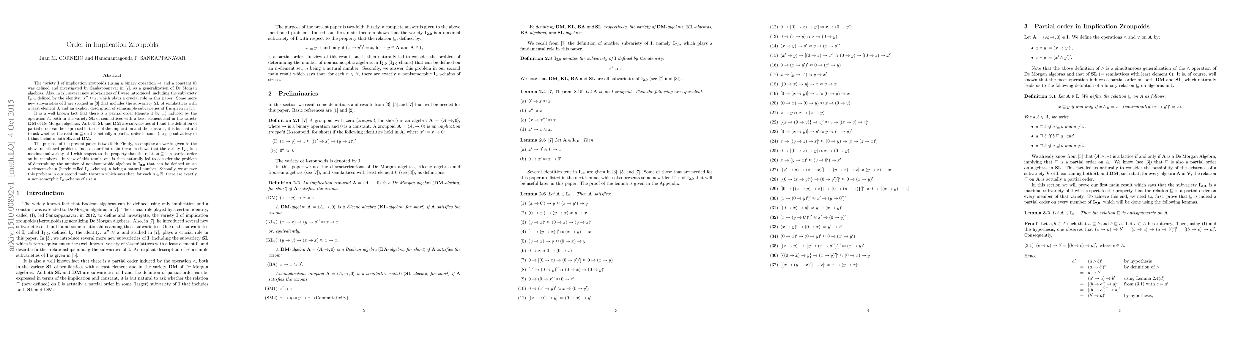 The variety $\mathbf{I}$ of implication zroupoids was defined and investigated by Sankappanavar ([7]) as a generalization of De Morgan algebras. Also, in [7], several new subvarieties of $\mathbf{I}$ were introduced, including the subvariety $\mathbf{I_{2,0}}$, defined by the identity: $x" \approx x$, which plays a crucial role in this paper. Several more new subvarieties of $\mathbf{I}$, including the subvariety $\mathbf{SL}$ of semilattices with a least element $0$, are studied in [3], and an explicit description of semisimple subvarieties of $\mathbf{I}$ is given in [5]. It is well known that the operation $\land$ induces a partial order ($\sqsubseteq$) in the variety $\mathbf{SL}$ and also in the variety $\mathbf{DM}$ of De Morgan algebras. As both $\mathbf{SL}$ and $\mathbf{DM}$ are subvarieties of $\mathbf{I}$ and the definition of partial order can be expressed in terms of the implication and the constant, it is but natural to ask whether the relation $\sqsubseteq$ (now defined) on $\mathbf{I}$ is actually a partial order in some (larger) subvariety of $\mathbf{I}$ that includes $\mathbf{SL}$ and $\mathbf{DM}$. The purpose of the present paper is two-fold: Firstly, a complete answer is given to the above mentioned problem. Indeed, our first main theorem shows that the variety $\mathbf{I_{2,0}}$ is a maximal subvariety of $\mathbf{I}$ with respect to the property that the relation $\sqsubseteq$ is a partial order on its members. In view of this result, one is then naturally led to consider the problem of determining the number of non-isomorphic algebras in $\mathbf{I_{2,0}}$ that can be defined on an $n$-element chain (herein called $\mathbf{I_{2,0}}$-chains), $n$ being a natural number. Secondly, we answer this problem in our second main theorem, which says that, for each $n \in \mathbb{N}$, there are exactly $n$ nonisomorphic $\mathbf{I_{2,0}}$-chains of size $n$.