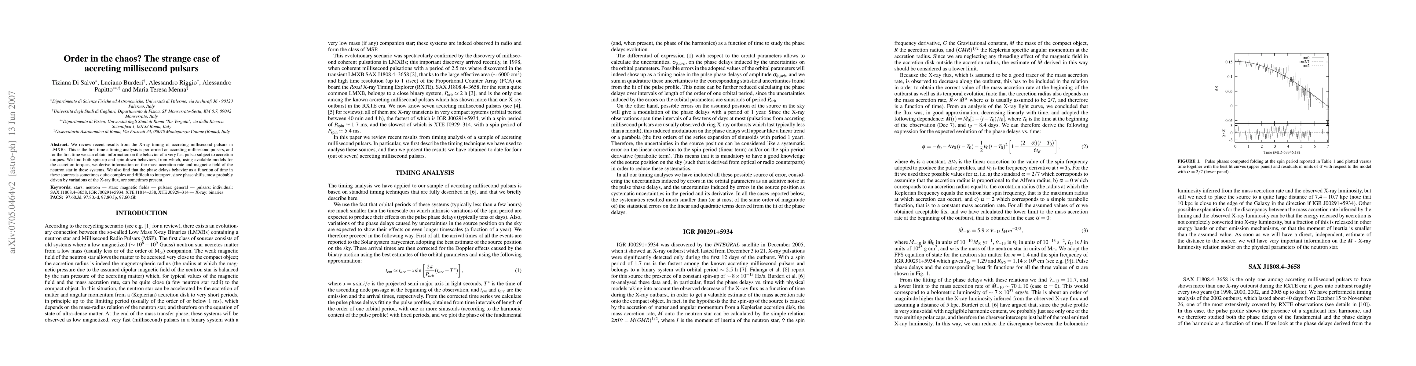 This paper reviews X-ray timing analysis of accreting millisecond pulsars, revealing both spin-up and spin-down behaviors that inform on mass accretion rates and magnetic fields. Complex phase delays, likely due to X-ray flux variations, complicate interpretation.