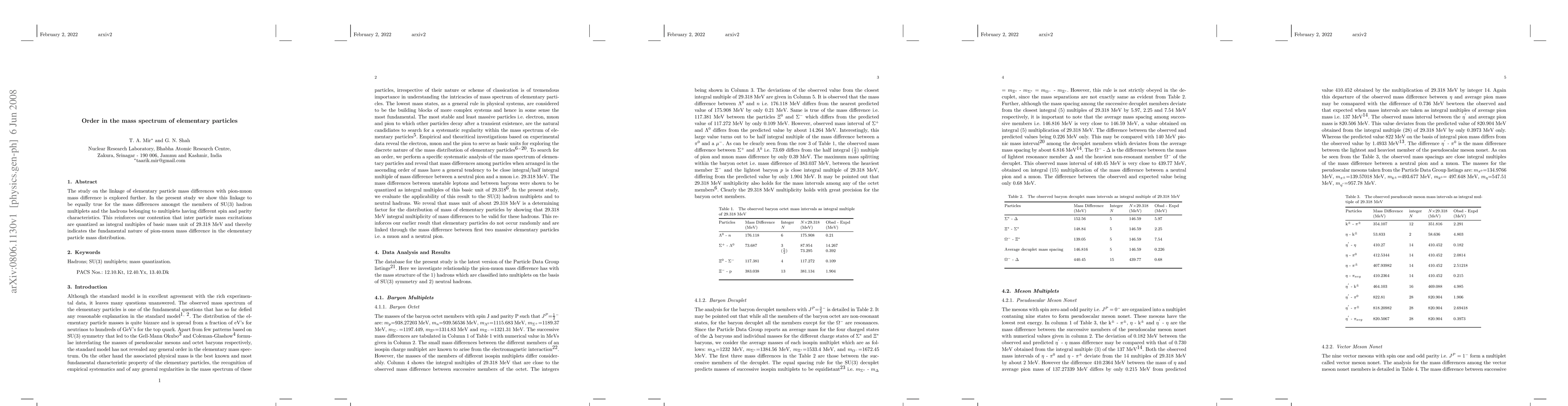 The study on the linkage of elementary particle mass differences with pion-muon mass difference is explored further. In the present study we show this linkage to be equally true for the mass differences amongst the members of SU(3) hadron multiplets and the hadrons belonging to multiplets having different spin and parity characteristics. This reinforces our contention that inter particle mass excitations are quantized as integral multiples of basic mass unit of 29.318 MeV and thereby indicates the fundamental nature of pion-muon mass difference in the elementary particle mass distribution.