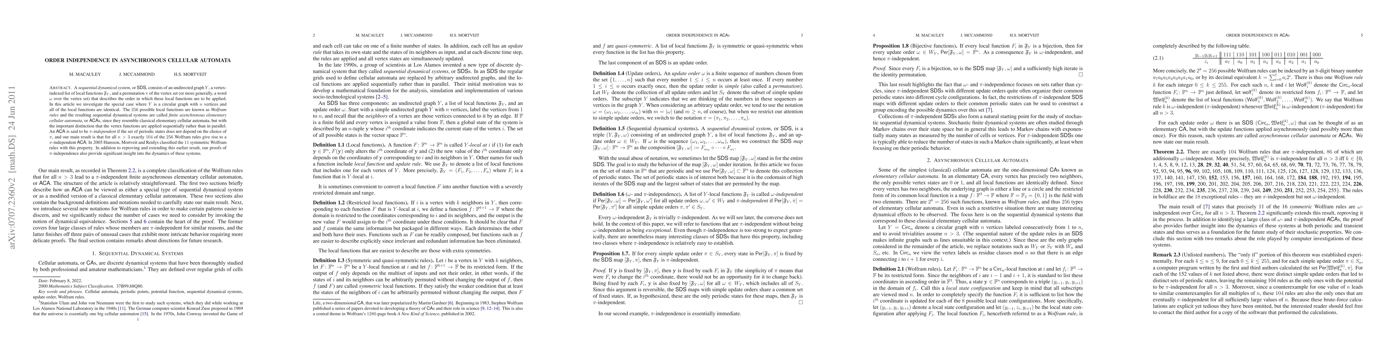 The study found that exactly 104 out of 256 possible local functions in asynchronous cellular automata result in systems that don't depend on the order of application, a phenomenon known as pi-independence, for all n greater than 3.