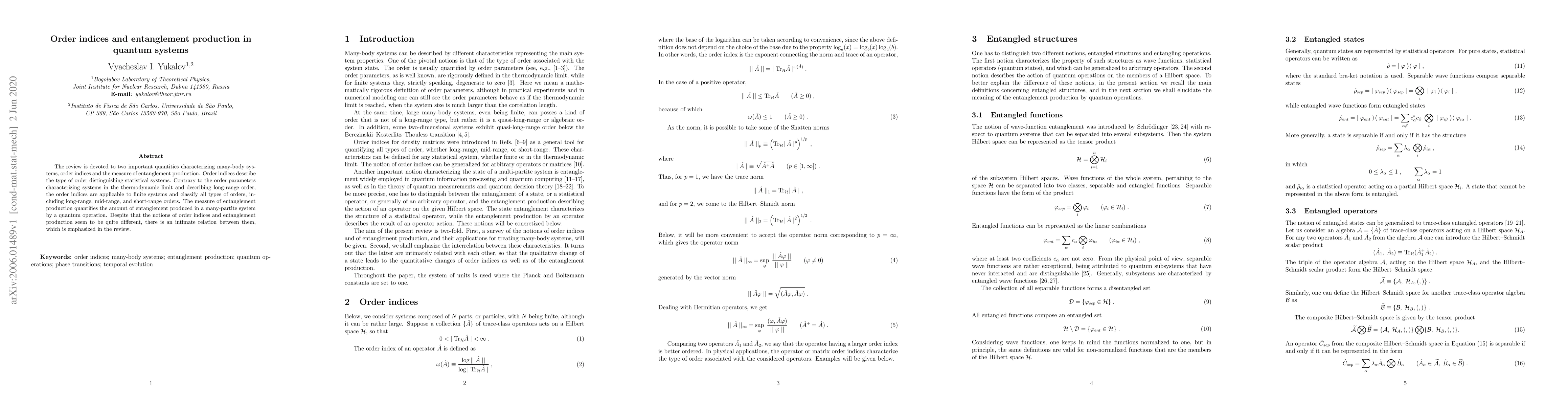 The review is devoted to two important quantities characterizing many-body systems, order indices and the measure of entanglement production. Order indices describe the type of order distinguishing statistical systems. Contrary to the order parameters characterizing systems in the thermodynamic limit and describing long-range order, the order indices are applicable to finite systems and classify all types of orders, including long-range, mid-range, and short-range orders. The measure of entanglement production quantifies the amount of entanglement produced in a many-partite system by a quantum operation. Despite that the notions of order indices and entanglement production seem to be quite different, there is an intimate relation between them, which is emphasized in the review.