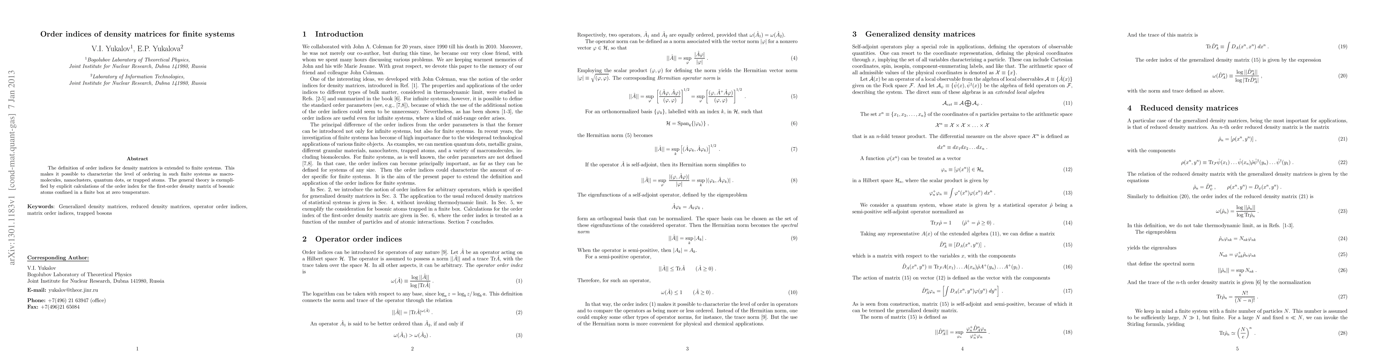 This paper extends the concept of order indices to density matrices for finite quantum systems, enabling the characterization of ordering levels in systems like macromolecules and quantum dots. It demonstrates the approach through calculations of the first-order density matrix order index for bosonic atoms in a confined space at zero temperature.