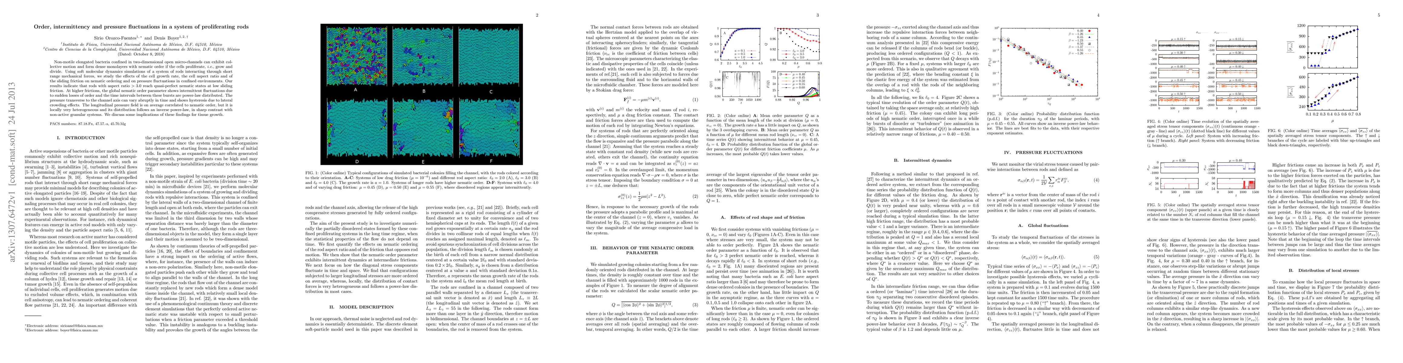 Non-motile elongated bacteria confined in two-dimensional open micro-channels can exhibit collective motion and form dense monolayers with nematic order if the cells proliferate, i.e., grow and divide. Using soft molecular dynamics simulations of a system of rods interacting through short range mechanical forces, we study the effects of the cell growth rate, the cell aspect ratio and of the sliding friction on nematic ordering and on pressure fluctuations in confined environments. Our results indicate that rods with aspect ratio >3.0 reach quasi-perfect nematic states at low sliding friction. At higher frictions, the global nematic order parameter shows intermittent fluctuations due to sudden losses of order and the time intervals between these bursts are power-law distributed. The pressure transverse to the channel axis can vary abruptly in time and shows hysteresis due to lateral crowding effects. The longitudinal pressure field is on average correlated to nematic order, but it is locally very heterogeneous and its distribution follows an inverse power-law, in sharp contrast with non-active granular systems. We discuss some implications of these findings for tissue growth.