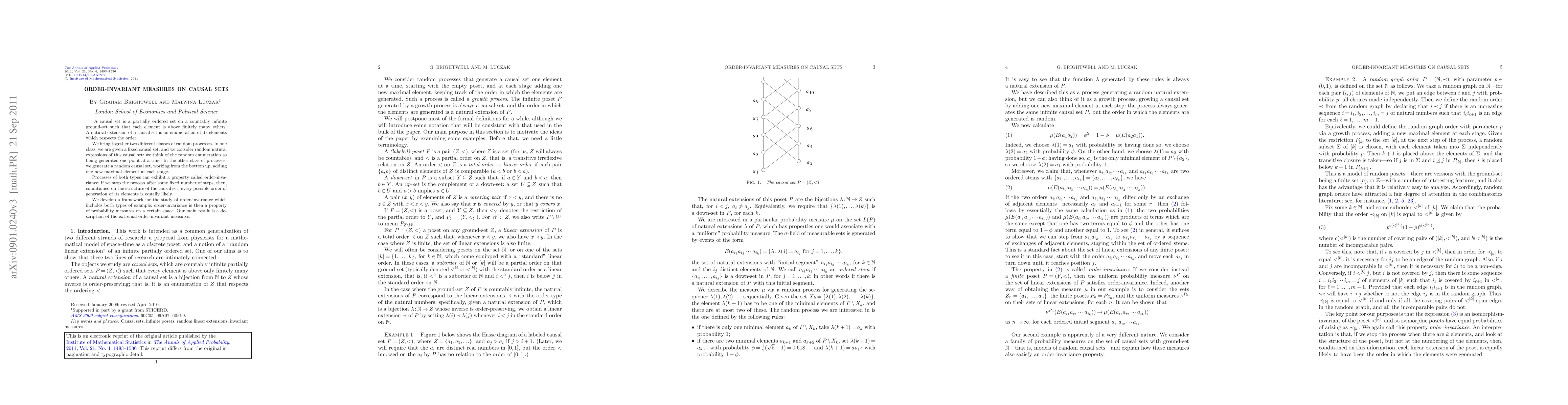 A causal set is a partially ordered set on a countably infinite ground-set such that each element is above finitely many others. A natural extension of a causal set is an enumeration of its elements which respects the order. We bring together two different classes of random processes. In one class, we are given a fixed causal set, and we consider random natural extensions of this causal set: we think of the random enumeration as being generated one point at a time. In the other class of processes, we generate a random causal set, working from the bottom up, adding one new maximal element at each stage. Processes of both types can exhibit a property called order-invariance: if we stop the process after some fixed number of steps, then, conditioned on the structure of the causal set, every possible order of generation of its elements is equally likely. We develop a framework for the study of order-invariance which includes both types of example: order-invariance is then a property of probability measures on a certain space. Our main result is a description of the extremal order-invariant measures.