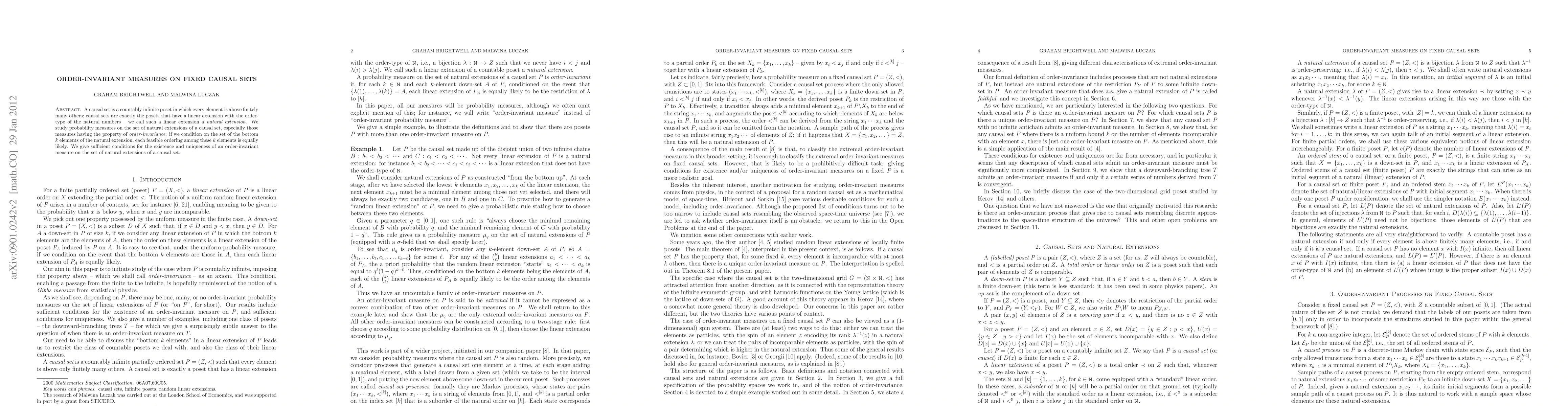 A causal set is a countably infinite poset in which every element is above finitely many others; causal sets are exactly the posets that have a linear extension with the order-type of the natural numbers -- we call such a linear extension a {\em natural extension}. We study probability measures on the set of natural extensions of a causal set, especially those measures having the property of {\em order-invariance}: if we condition on the set of the bottom $k$ elements of the natural extension, each possible ordering among these $k$ elements is equally likely. We give sufficient conditions for the existence and uniqueness of an order-invariant measure on the set of natural extensions of a causal set.