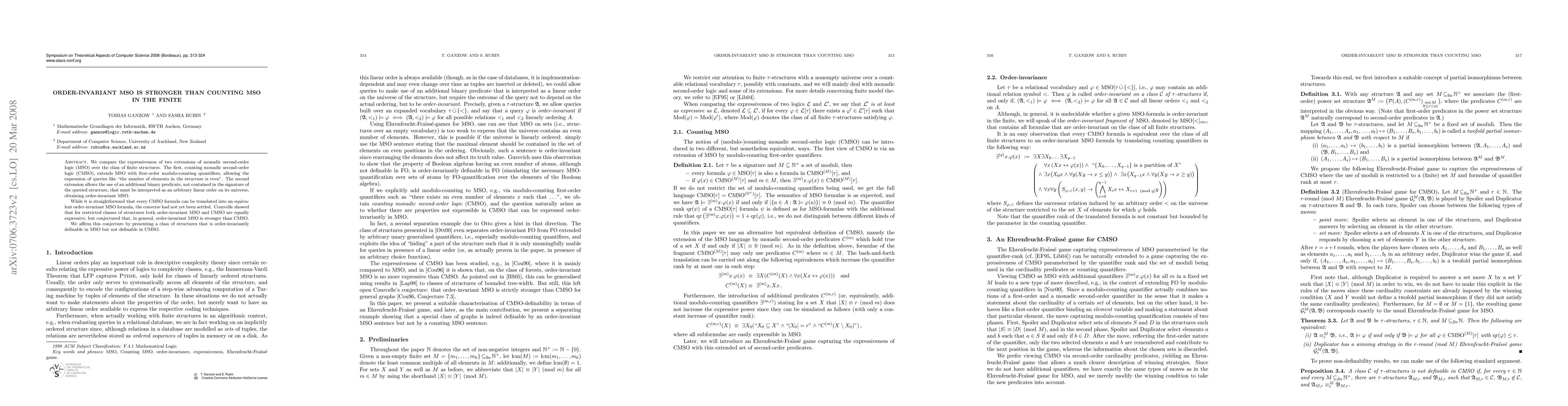 This paper demonstrates that order-invariant MSO is more expressive than counting MSO (CMSO) by presenting a class of finite structures that can be defined using order-invariant MSO but not CMSO, affirming a conjecture by Courcelle.