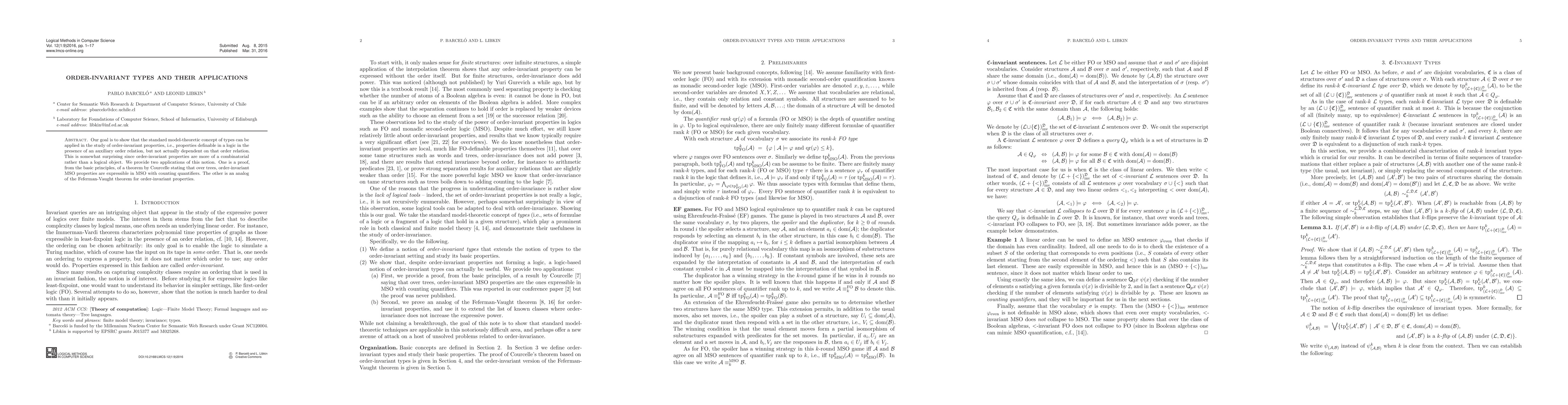 Research shows that order-invariant properties can be expressed using model-theoretic types, surprising the field of combinatorics. Applications include proving Courcelle's theorem on MSO properties in trees and an analog of the Feferman-Vaught theorem for these properties.