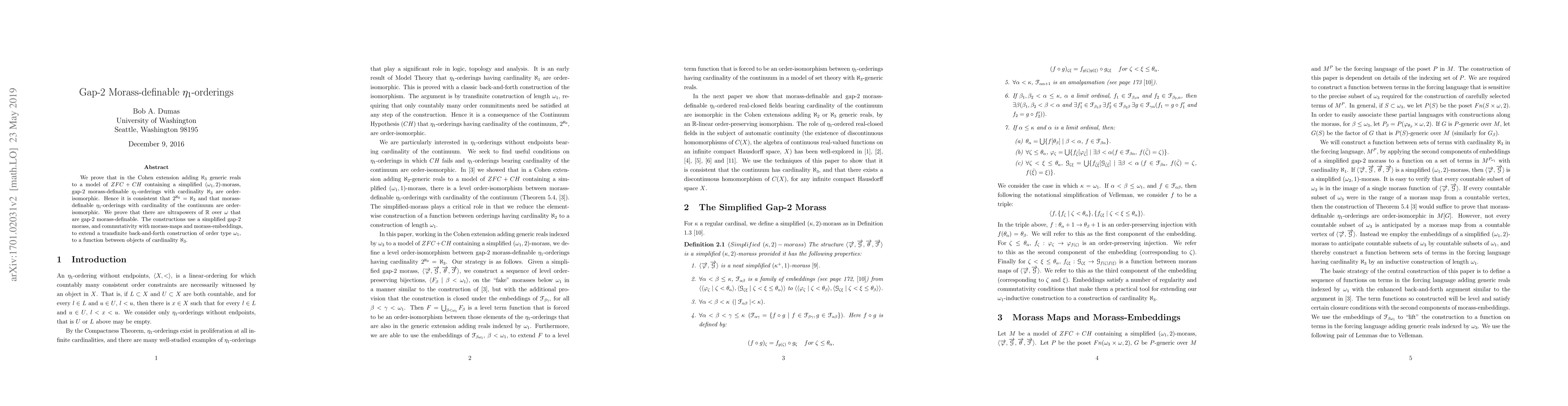 We prove that in the Cohen extension adding $\aleph_3$ generic reals to a model of $ZFC+CH$ containing a simplified $(\omega_1,2)$-morass, gap-2 morass-definable $\eta_1$-orderings with cardinality $\aleph_3$ are order-isomorphic. Hence it is consistent that the $2^{\aleph_0}=\aleph_3$ and that morass-definable $\eta_1$-orderings with cardinality of the continuum are order-isomorphic. We prove that there are ultrapowers of $\mathbb{R}$ over $\omega$ that are gap-2 morass-definable. The constructions use a simplified gap-2 morass, and commutativity with morass-maps and morass-embeddings, to extend a transfinite back-and-forth construction of order type $\omega_1$, to a function between objects of cardinality $\aleph_3$.