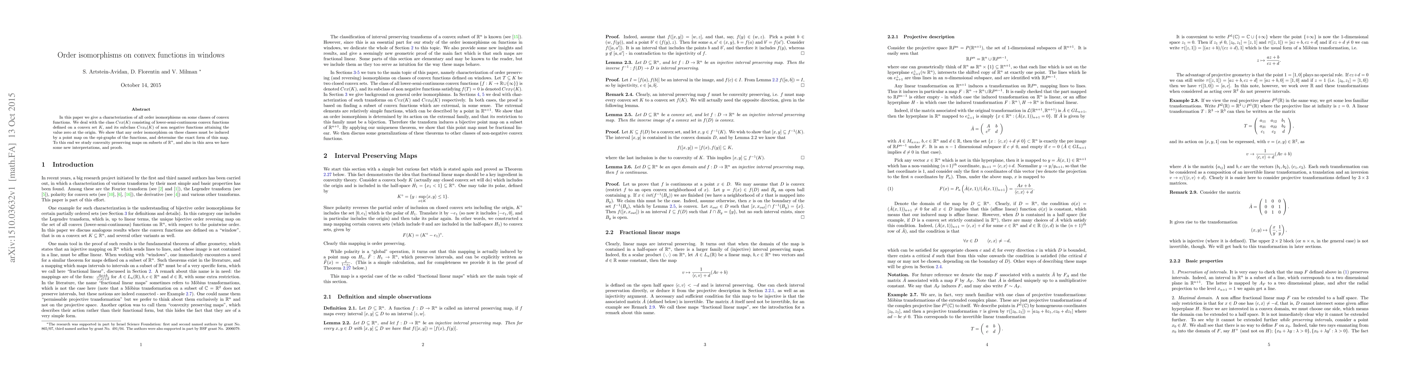 In this paper we give a characterization of all order isomorphisms on some classes of convex functions. We deal with the class $Cvx(K)$ consisting of lower-semi-continuous convex functions defined on a convex set $K$, and its subclass $Cvx_0(K)$ of non negative functions attaining the value zero at the origin. We show that any order isomorphism on these classes must be induced by a point map on the epi-graphs of the functions, and determine the exact form of this map. To this end we study convexity preserving maps on subsets of ${\mathbb R}^n$, and also in this area we have some new interpretations, and proofs.