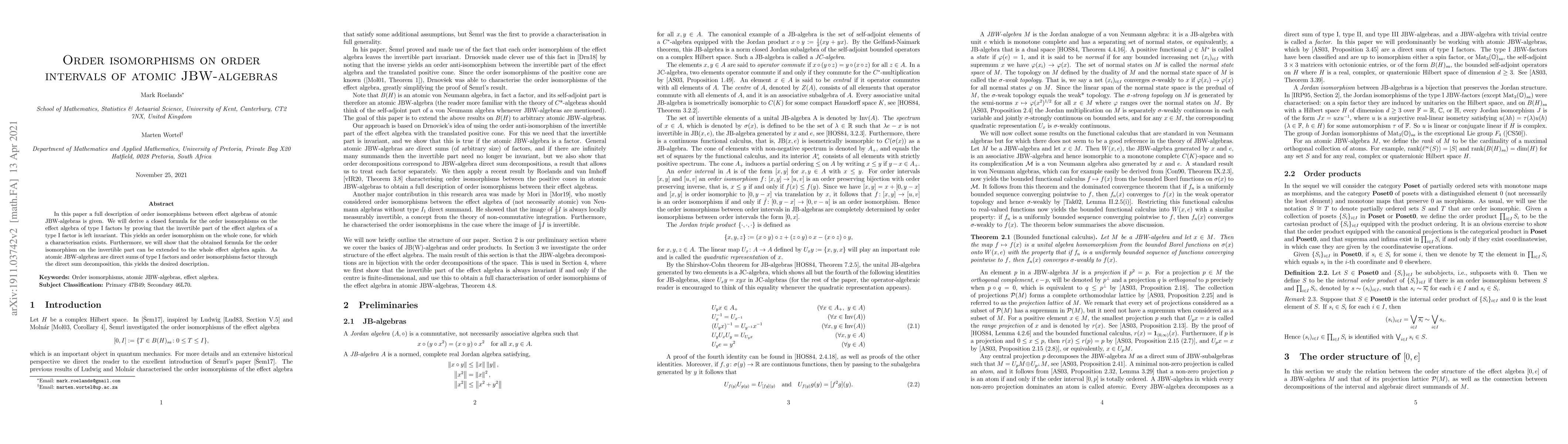 In this paper a full description of order isomorphisms between effect algebras of atomic JBW-algebras is given. We will derive a closed formula for the order isomorphisms on the effect algebra of type I factors by proving that the invertible part of the effect algebra of a type I factor is left invariant. This yields an order isomorphism on the whole cone, for which a characterisation exists. Furthermore, we will show that the obtained formula for the order isomorphism on the invertible part can be extended to the whole effect algebra again. As atomic JBW-algebras are direct sums of type I factors and order isomorphisms factor through the direct sum decomposition, this yields the desired description.