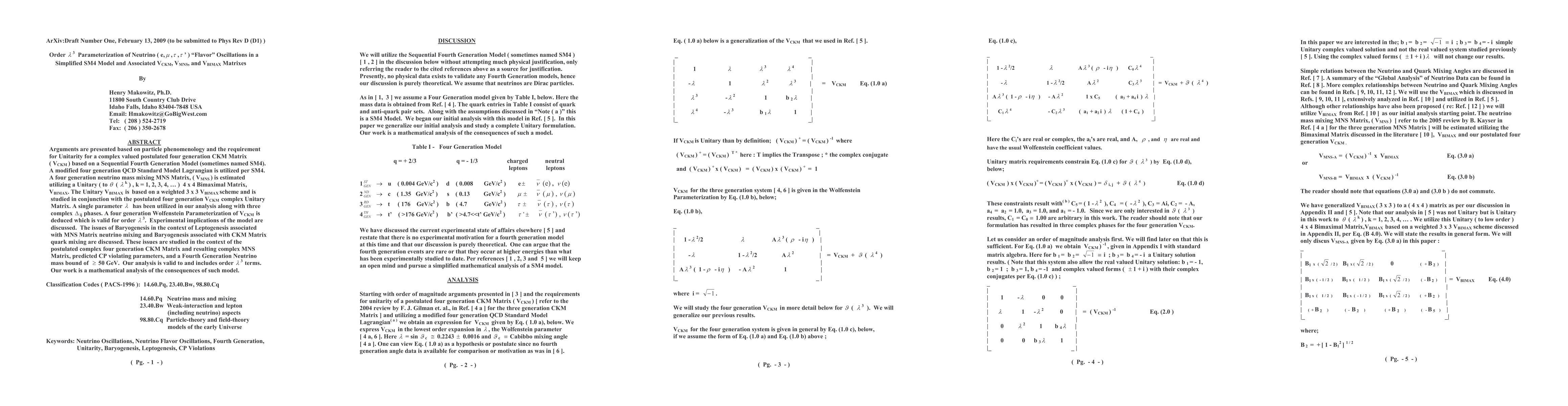 Arguments are presented based on particle phenomenology and the requirement for Unitarity for a complex valued postulated four generation CKM Matrix (VCKM ) based on a Sequential Fourth Generation Model (sometimes named SM4). A modified four generation QCD Standard Model Lagrangian is utilized per SM4. A four generation neutrino mass mixing MNS Matrix, (VMNS) is estimated utilizing a Unitary (to Order (Lambda**k), k = 1, 2, 3, 4, etc) 4 x 4 Bimaximal Matrix, VBIMAX. The Unitary VBIMAX is based on a weighted 3 x 3 VBIMAX scheme and is studied in conjunction with the postulated four generation VCKM complex Unitary Matrix. A single parameter has been utilized in our analysis along with three complex DELTA(i,j) phases. A four generation Wolfenstein Parameterization of VCKM is deduced which is valid for order Lambda**3. Experimental implications of the model are discussed. The issues of Baryogenesis in the context of Leptogenesis associated with MNS Matrix neutrino mixing and Baryogenesis associated with CKM Matrix quark mixing are discussed. These issues are studied in the context of the postulated complex four generation CKM Matrix and resulting complex MNS Matrix, predicted CP violating parameters, and a Fourth Generation Neutrino mass bound of equal to or greater than 50 GeV. Our analysis is valid to and includes order Lambda**3 terms. Our work is a mathematical analysis of the consequences of such model. Classification Codes (PACS-1996): 14.60.Pq, 23.40.Bw, 98.80.Cq 14.60.Pq Neutrino mass and mixing 23.40.Bw Weak-interaction and lepton (including neutrino) aspects 98.80.Cq Particle-theory and field- theory models of the early Universe Keywords: Neutrino Oscillations, Neutrino Flavor Oscillations, Fourth Generation,Unitarity, Baryogenesis, Leptogenesis, CP Violations