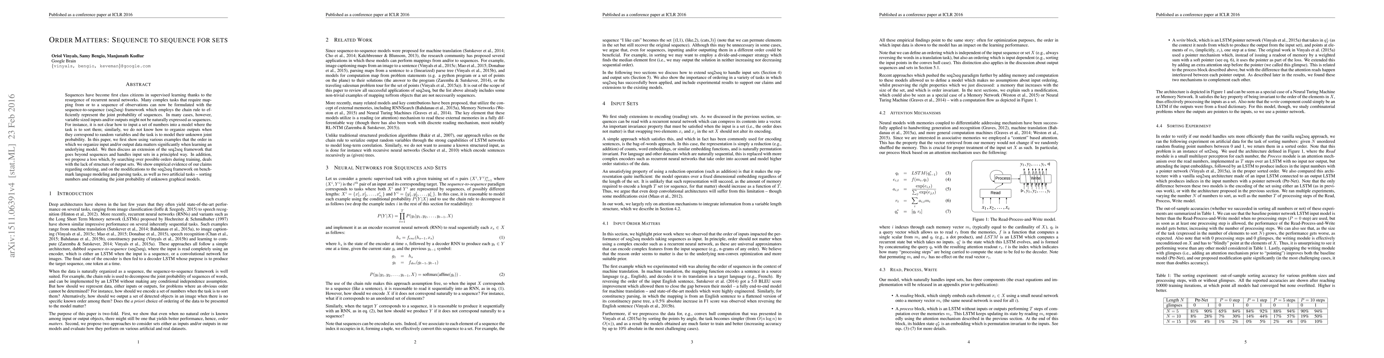 Sequences have become first class citizens in supervised learning thanks to the resurgence of recurrent neural networks. Many complex tasks that require mapping from or to a sequence of observations can now be formulated with the sequence-to-sequence (seq2seq) framework which employs the chain rule to efficiently represent the joint probability of sequences. In many cases, however, variable sized inputs and/or outputs might not be naturally expressed as sequences. For instance, it is not clear how to input a set of numbers into a model where the task is to sort them; similarly, we do not know how to organize outputs when they correspond to random variables and the task is to model their unknown joint probability. In this paper, we first show using various examples that the order in which we organize input and/or output data matters significantly when learning an underlying model. We then discuss an extension of the seq2seq framework that goes beyond sequences and handles input sets in a principled way. In addition, we propose a loss which, by searching over possible orders during training, deals with the lack of structure of output sets. We show empirical evidence of our claims regarding ordering, and on the modifications to the seq2seq framework on benchmark language modeling and parsing tasks, as well as two artificial tasks -- sorting numbers and estimating the joint probability of unknown graphical models.