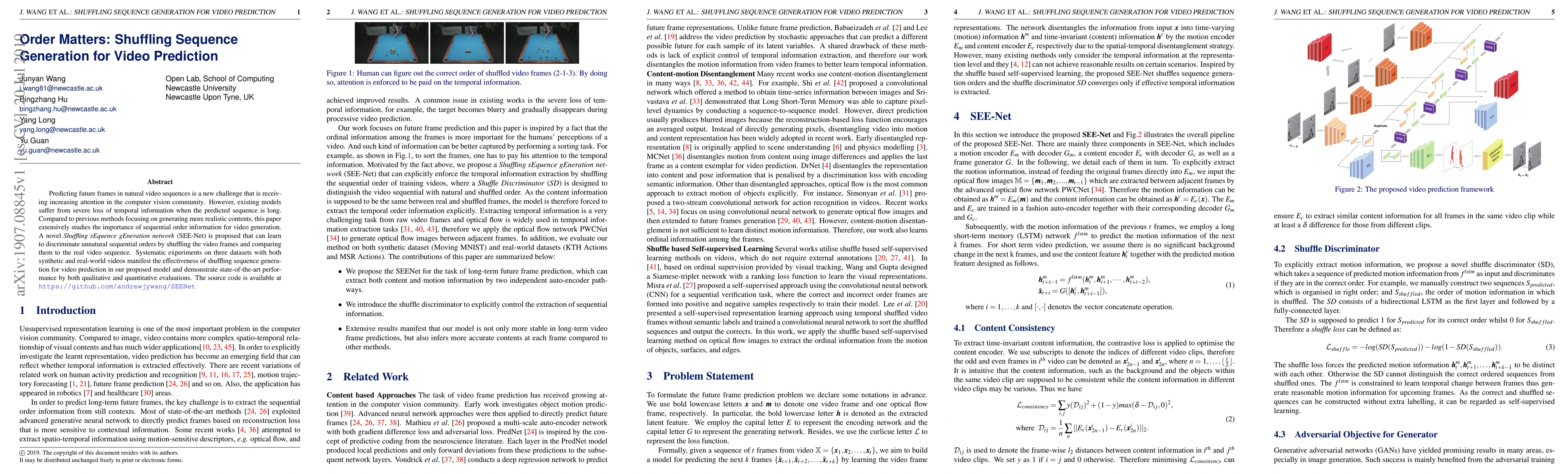 Predicting future frames in natural video sequences is a new challenge that is receiving increasing attention in the computer vision community. However, existing models suffer from severe loss of temporal information when the predicted sequence is long. Compared to previous methods focusing on generating more realistic contents, this paper extensively studies the importance of sequential order information for video generation. A novel Shuffling sEquence gEneration network (SEE-Net) is proposed that can learn to discriminate unnatural sequential orders by shuffling the video frames and comparing them to the real video sequence. Systematic experiments on three datasets with both synthetic and real-world videos manifest the effectiveness of shuffling sequence generation for video prediction in our proposed model and demonstrate state-of-the-art performance by both qualitative and quantitative evaluations. The source code is available at https://github.com/andrewjywang/SEENet.