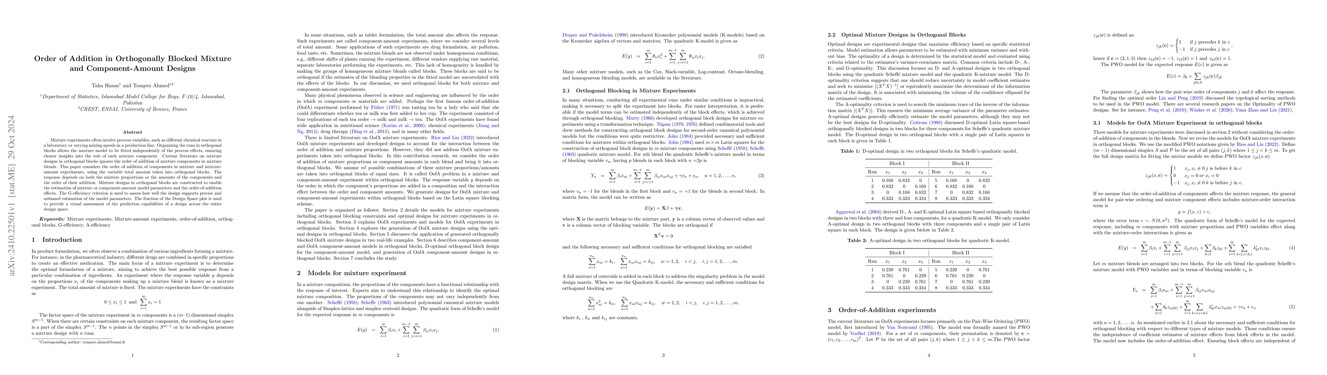This paper examines the impact of the order of addition of components in orthogonally blocked mixture designs, proposing new designs to estimate mixture and component-amount effects, alongside order-of-addition impacts. It uses G-efficiency and Design Space plots to evaluate the precision and prediction capabilities of these designs.