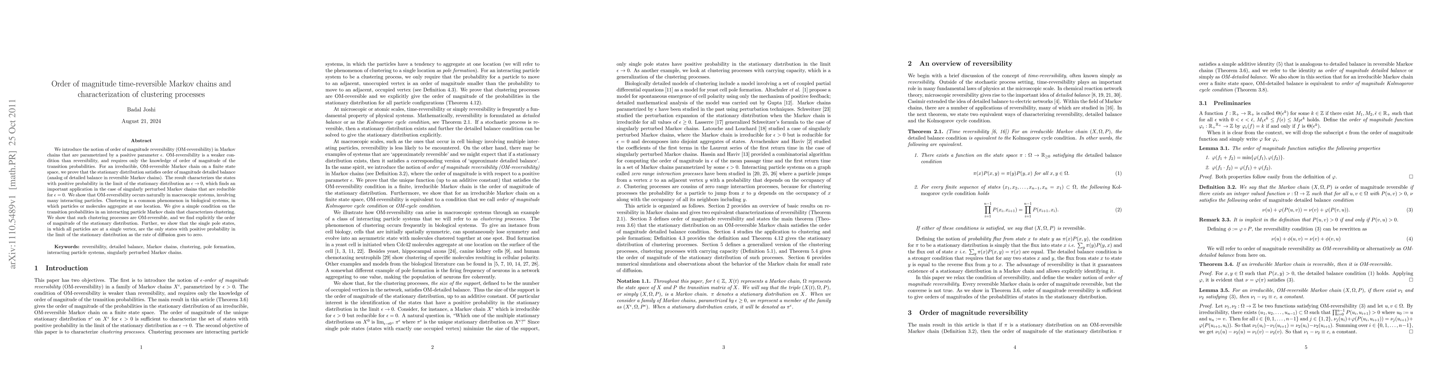 We introduce the notion of order of magnitude reversibility (OM-reversibility) in Markov chains that are parametrized by a positive parameter $\ep$. OM-reversibility is a weaker condition than reversibility, and requires only the knowledge of order of magnitude of the transition probabilities. For an irreducible, OM-reversible Markov chain on a finite state space, we prove that the stationary distribution satisfies order of magnitude detailed balance (analog of detailed balance in reversible Markov chains). The result characterizes the states with positive probability in the limit of the stationary distribution as $\ep \to 0$, which finds an important application in the case of singularly perturbed Markov chains that are reducible for $\ep=0$. We show that OM-reversibility occurs naturally in macroscopic systems, involving many interacting particles. Clustering is a common phenomenon in biological systems, in which particles or molecules aggregate at one location. We give a simple condition on the transition probabilities in an interacting particle Markov chain that characterizes clustering. We show that such clustering processes are OM-reversible, and we find explicitly the order of magnitude of the stationary distribution. Further, we show that the single pole states, in which all particles are at a single vertex, are the only states with positive probability in the limit of the stationary distribution as the rate of diffusion goes to zero.