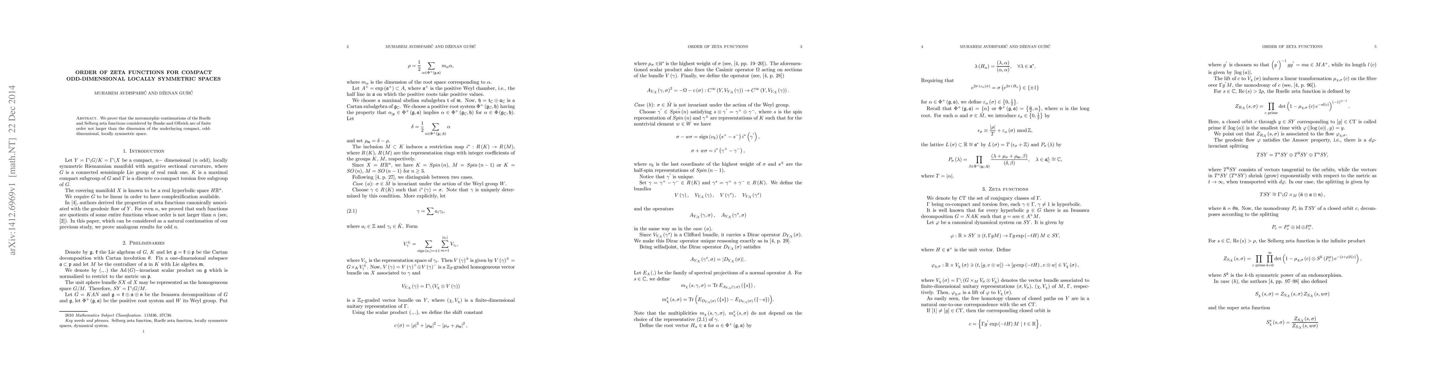Summary: This paper establishes that the meromorphic continuations of Ruelle and Selberg zeta functions for compact odd-dimensional locally symmetric spaces have a finite order, specifically not exceeding the dimension of the underlying space. This result provides a significant bound on the complexity of these zeta functions.