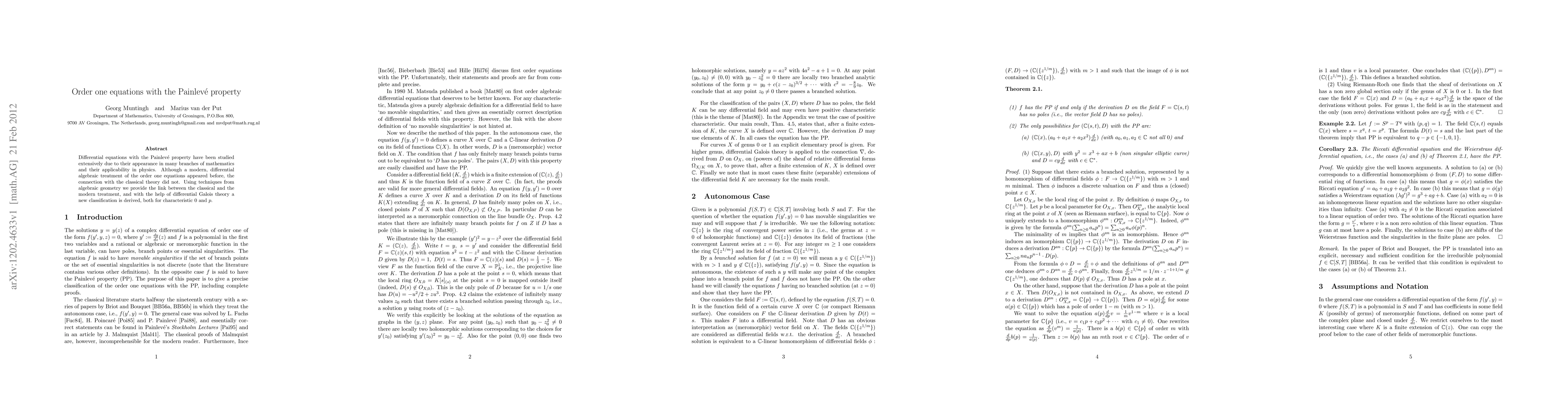 Differential equations with the Painlev\'e property have been studied extensively due to their appearance in many branches of mathematics and their applicability in physics. Although a modern, differential algebraic treatment of the order one equations appeared before, the connection with the classical theory did not. Using techniques from algebraic geometry we provide the link between the classical and the modern treatment, and with the help of differential Galois theory a new classification is derived, both for characteristic 0 and p.