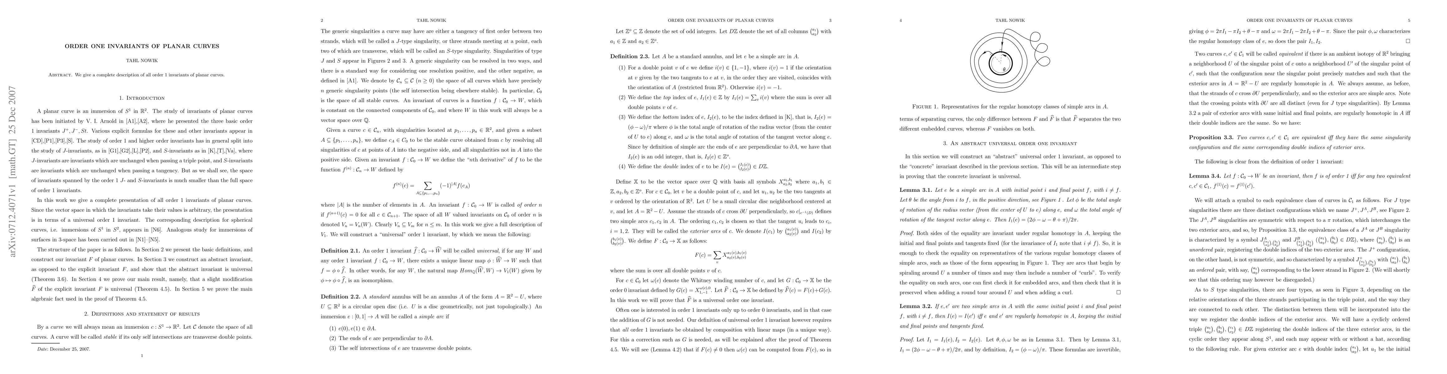 Summary: This paper provides a comprehensive account of the first-order invariants that characterize planar curves, detailing their mathematical properties and significance.