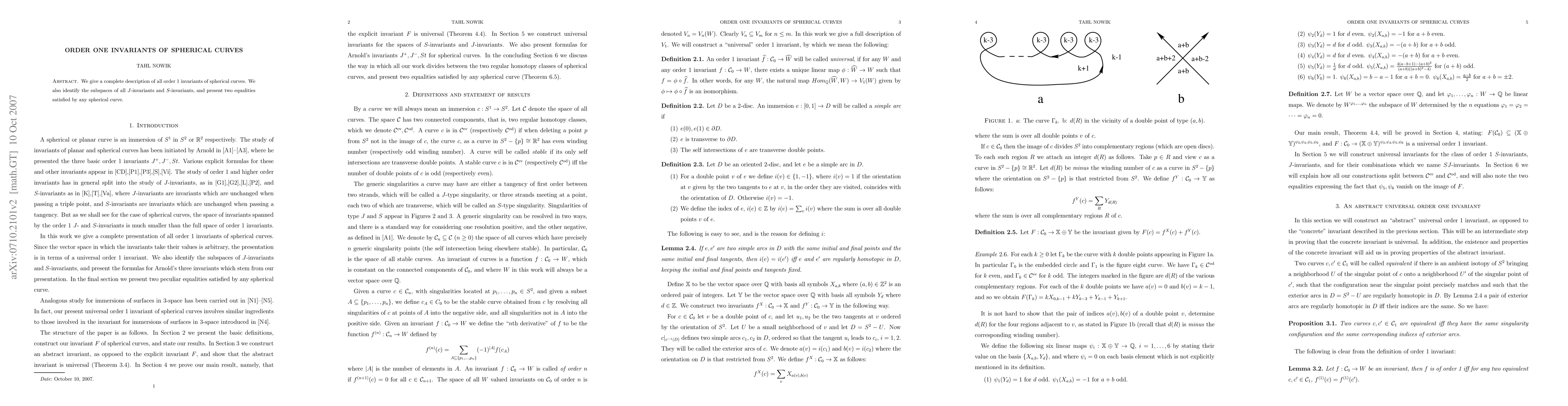 Summary: This paper provides a comprehensive description of order 1 invariants for spherical curves, identifies the subspaces of J-invariants and S-invariants, and establishes two equalities that hold for any spherical curve.