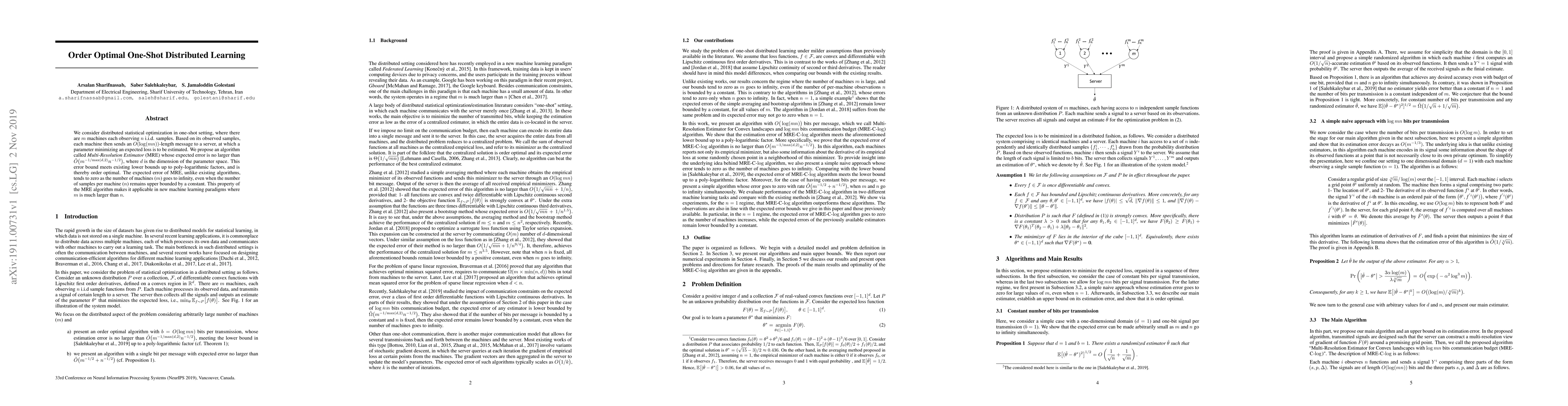 This paper proposes the Multi-Resolution Estimator (MRE) algorithm for one-shot distributed learning, achieving an order optimal error bound of $\tilde{O}\big(m^{-{1}/{\max(d,2)}} n^{-1/2}\big)$ that meets existing lower bounds. Unlike existing methods, MRE's error diminishes as the number of machines increases, even with a constant number of samples per machine.