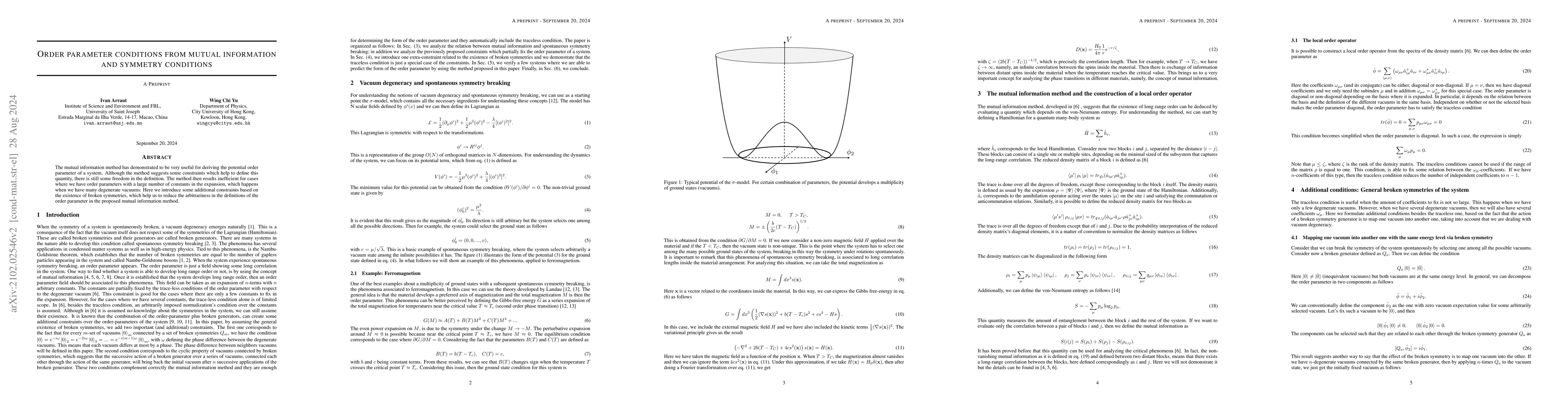 Researchers introduce additional constraints to refine order parameter definitions based on broken symmetries, reducing arbitrariness in the mutual information method for deriving potential order parameters.