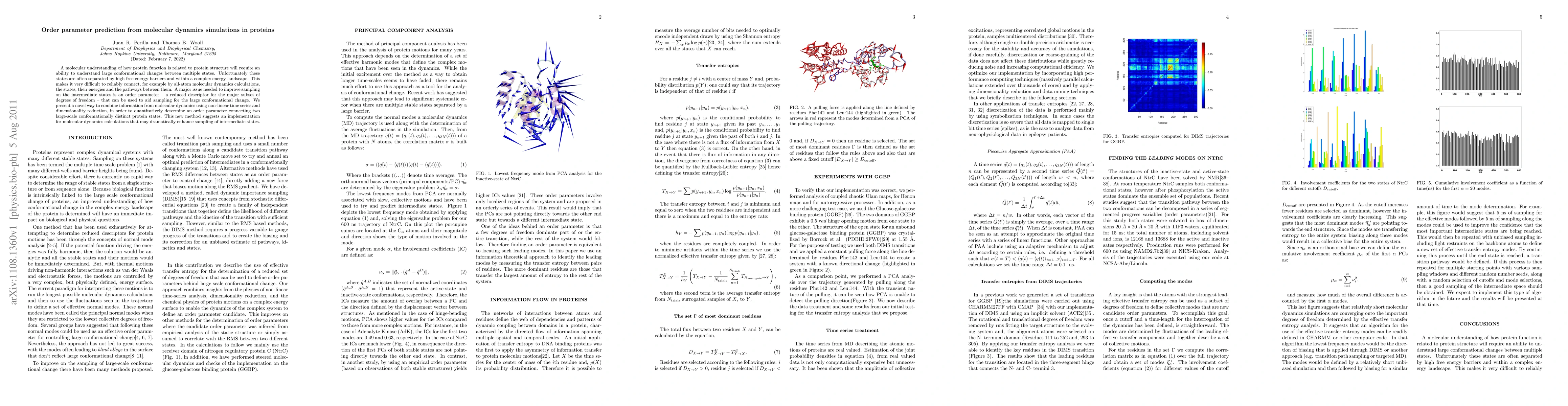 A molecular understanding of how protein function is related to protein structure will require an ability to understand large conformational changes between multiple states. Unfortunately these states are often separated by high free energy barriers and within a complex energy landscape. This makes it very difficult to reliably connect, for example by all-atom molecular dynamics calculations, the states, their energies and the pathways between them. A major issue needed to improve sampling on the intermediate states is an order parameter -- a reduced descriptor for the major subset of degrees of freedom -- that can be used to aid sampling for the large conformational change. We present a novel way to combine information from molecular dynamics using non-linear time series and dimensionality reduction, in order to quantitatively determine an order parameter connecting two large-scale conformationally distinct protein states. This new method suggests an implementation for molecular dynamics calculations that may dramatically enhance sampling of intermediate states.