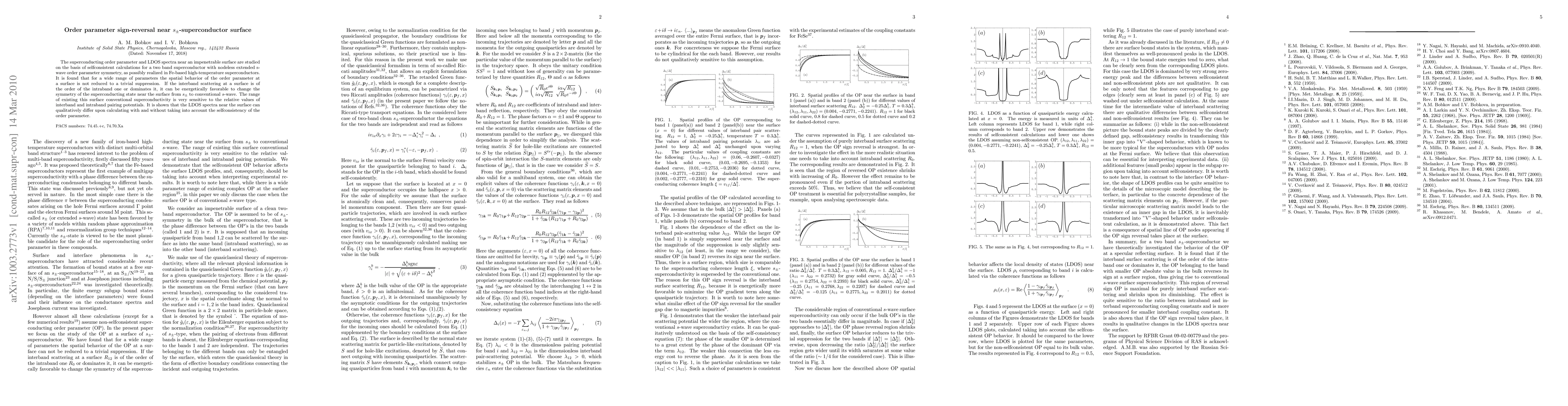 The superconducting order parameter and LDOS spectra near an impenetrable surface are studied on the basis of selfconsistent calculations for a two band superconductor with nodeless extended s-+wave order parameter symmetry, as possibly realized in Fe-based high-temperature superconductors. It is found that for a wide range of parameters the spatial behavior of the order parameter at a surface is not reduced to a trivial suppression. If the interband scattering at a surface is of the order of the intraband one or dominates it, it can be energetically favorable to change the symmetry of the superconducting state near the surface from $s_{\pm}$ to conventional s-wave. The range of existing this surface conventional superconductivity is very sensitive to the relative values of interband and intraband pairing potentials. It is shown that the LDOS spectra near the surface can qualitatively differ upon calculating with and without taking into account the selfconsistency of the order parameter.