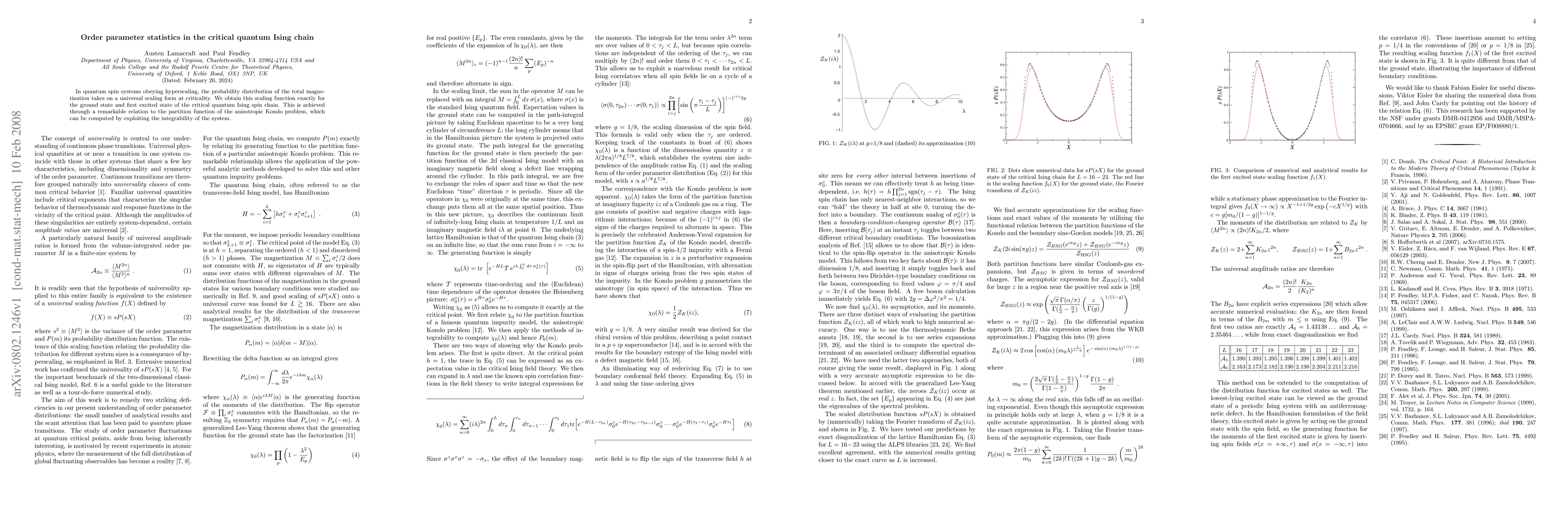 This paper derives the exact scaling function for the probability distribution of total magnetization in the critical quantum Ising chain, revealing its universal scaling form at criticality. The result is achieved by linking the system to the anisotropic Kondo problem, leveraging the integrability of the quantum Ising chain.