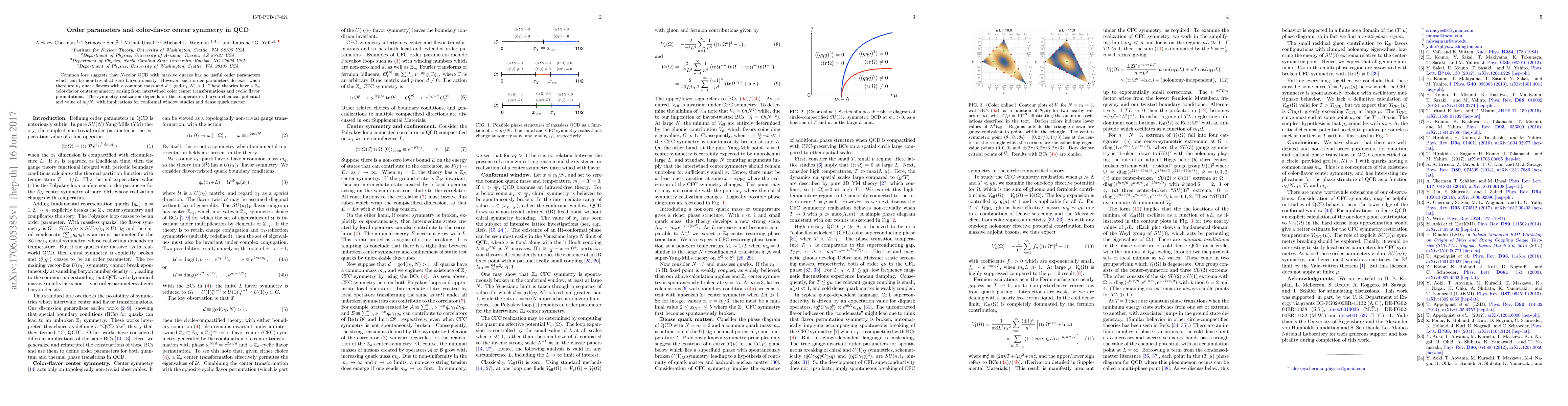 Common lore suggests that $N$-color QCD with massive quarks has no useful order parameters which can be non-trivial at zero baryon density. However, such order parameters do exist when there are $n_f$ quark flavors with a common mass and $d\equiv\gcd(n_f,N) > 1$. These theories have a $\mathbb Z_d$ color-flavor center symmetry arising from intertwined color center transformations and cyclic flavor permutations. The symmetry realization depends on the temperature, baryon chemical potential and value of $n_f/N$, with implications for conformal window studies and dense quark matter.