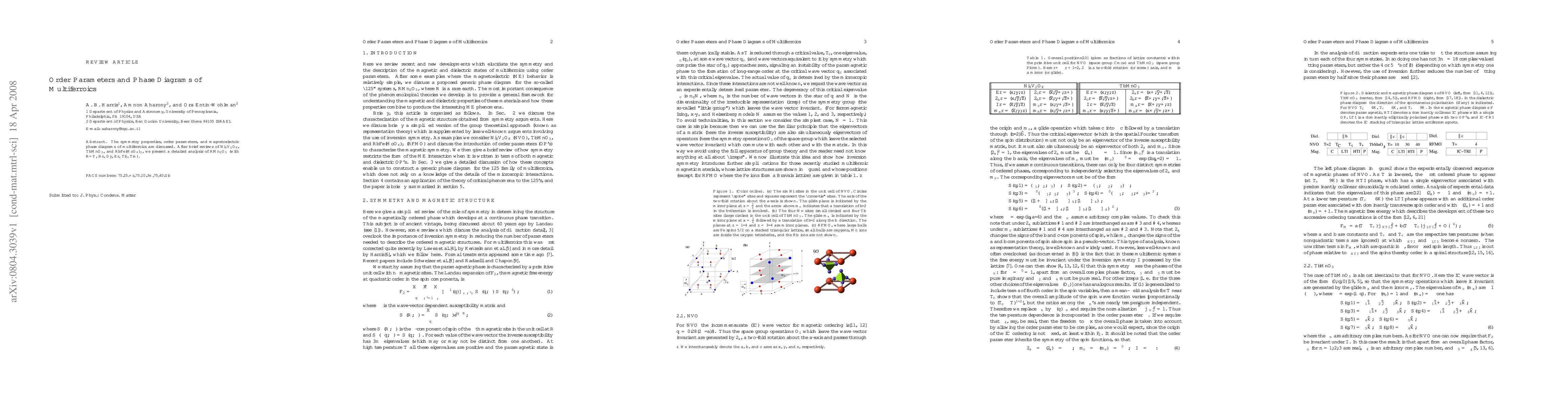 The symmetry properties, order parameters, and magnetoelectric phase diagrams of multiferroics are discussed. After brief reviews of Ni$_3$V$_2$O$_8$, TbMnO$_3$, and RbFe(MoO$_4$)$_2$, we present a detailed analysis of RMn$_2$O$_5$ (with R=Y, Ho, Dy, Er, Tb, Tm).