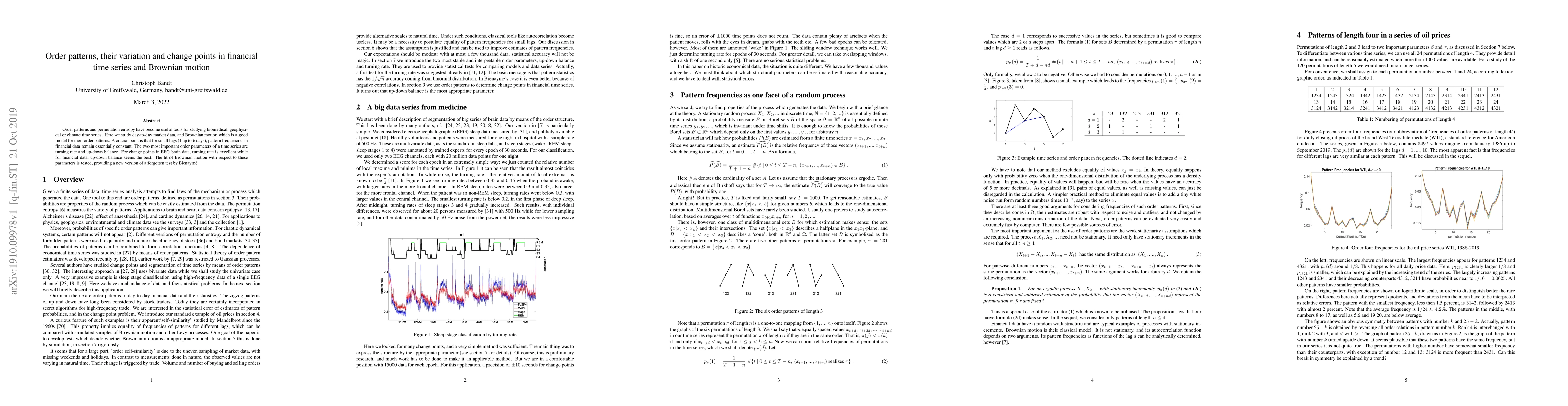 Order patterns and permutation entropy have become useful tools for studying biomedical, geophysical or climate time series. Here we study day-to-day market data, and Brownian motion which is a good model for their order patterns. A crucial point is that for small lags (1 up to 6 days), pattern frequencies in financial data remain essentially constant. The two most important order parameters of a time series are turning rate and up-down balance. For change points in EEG brain data, turning rate is excellent while for financial data, up-down balance seems the best. The fit of Brownian motion with respect to these parameters is tested, providing a new version of a forgotten test by Bienaym'e.