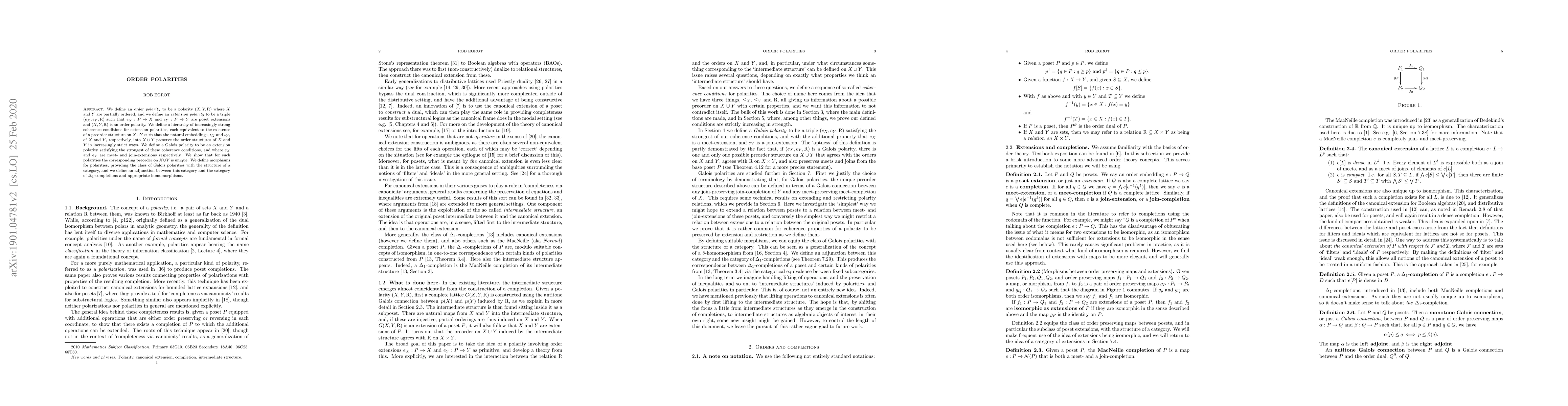 We define an order polarity to be a polarity $(X,Y,R)$ where $X$ and $Y$ are partially ordered, and we define an extension polarity to be a triple $(e_X,e_Y,R)$ such that $e_X:P\to X$ and $e_Y:P\to Y$ are poset extensions and $(X,Y,R)$ is an order polarity. We define a hierarchy of increasingly strong coherence conditions for extension polarities, each equivalent to the existence of a pre-order structure on $X\cup Y$ such that the natural embeddings, $\iota_X$ and $\iota_Y$, of $X$ and $Y$, respectively, into $X\cup Y$ preserve the order structures of $X$ and $Y$ in increasingly strict ways. We define a Galois polarity to be an extension polarity where $e_X$ and $e_Y$ are meet- and join-extensions respectively, and we show that for such polarities there is a unique pre-order on $X\cup Y$ such that $\iota_X$ and $\iota_Y$ satisfy particularly strong preservation properties. We define morphisms for polarities, providing the class of Galois polarities with the structure of a category, and we define an adjunction between this category and the category of $\Delta_1$-completions and appropriate homomorphisms. We formalize the theory of extension polarities and prove a duality principle to the effect that if a statement is true for all extension polarities then so too must be its dual statement.