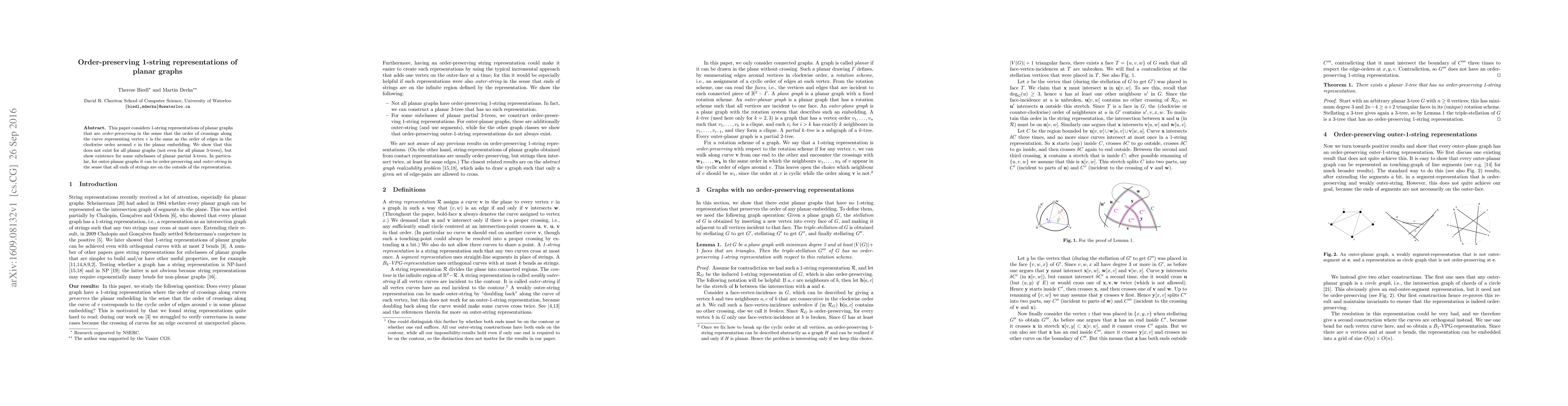 This research is novel because it explores the existence and properties of order-preserving 1-string representations in planar graphs
