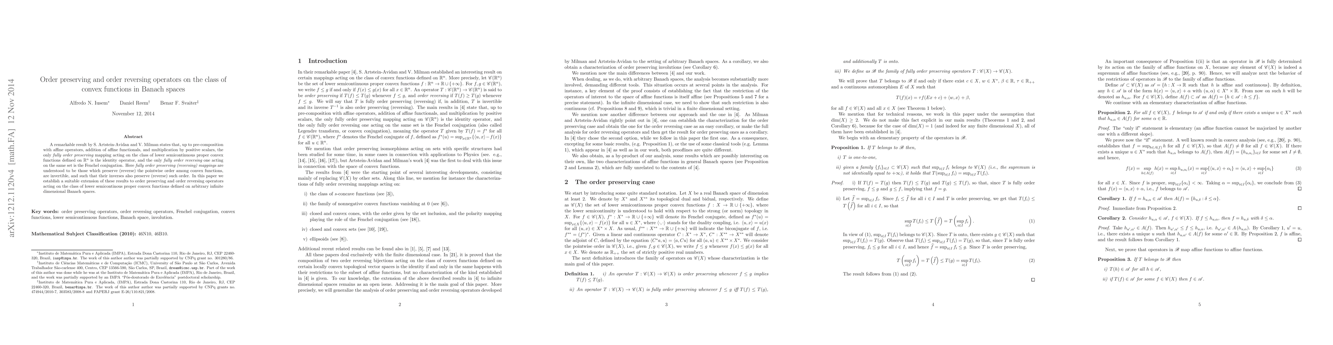 This paper extends results by Artstein-Avidan and Milman on order preserving and reversing operators for convex functions in $\mathbb{R}^n$ to infinite dimensional Banach spaces, showing that the identity operator is the only fully order preserving mapping and Fenchel conjugation is the only fully order reversing one.