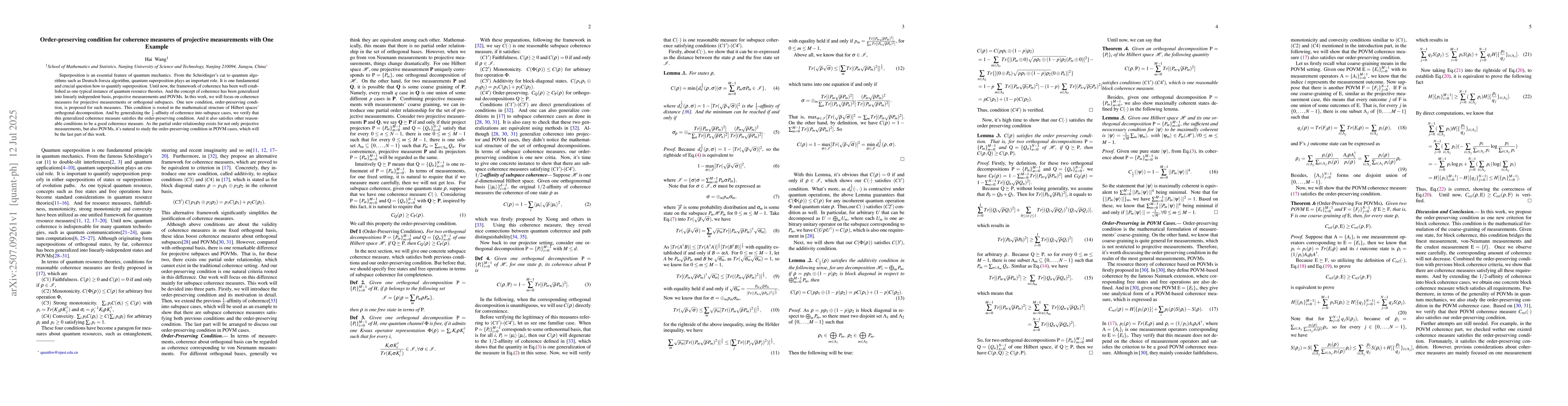 Superposition is an essential feature of quantum mechanics. From the Schrodinger's cat to quantum algorithms such as Deutsch-Jorsza algorithm, quantum superposition plays an important role. It is one fundamental and crucial question how to quantify superposition. Until now, the framework of coherence has been well established as one typical instance of quantum resource theories. And the concept of coherence has been generalized into linearly independent basis, projective measurements and POVMs. In this work, we will focus on coherence measures for projective measurements or orthogonal subspaces. One new condition, order-preserving condition, is proposed for such measures. This condition is rooted in the mathematical structure of Hilbert spaces' orthogonal decomposition. And by generalizing the 1/2-affinity of coherence into subspace cases, we verify that this generalized coherence measure satisfies the order-preserving condition. And it also satisfies other reasonable conditions to be a good coherence measure. As the partial order relationship exists for not only projective measurements, but also POVMs, it's natural to study the order-preserving condition in POVM cases, which will be the last part of this work.